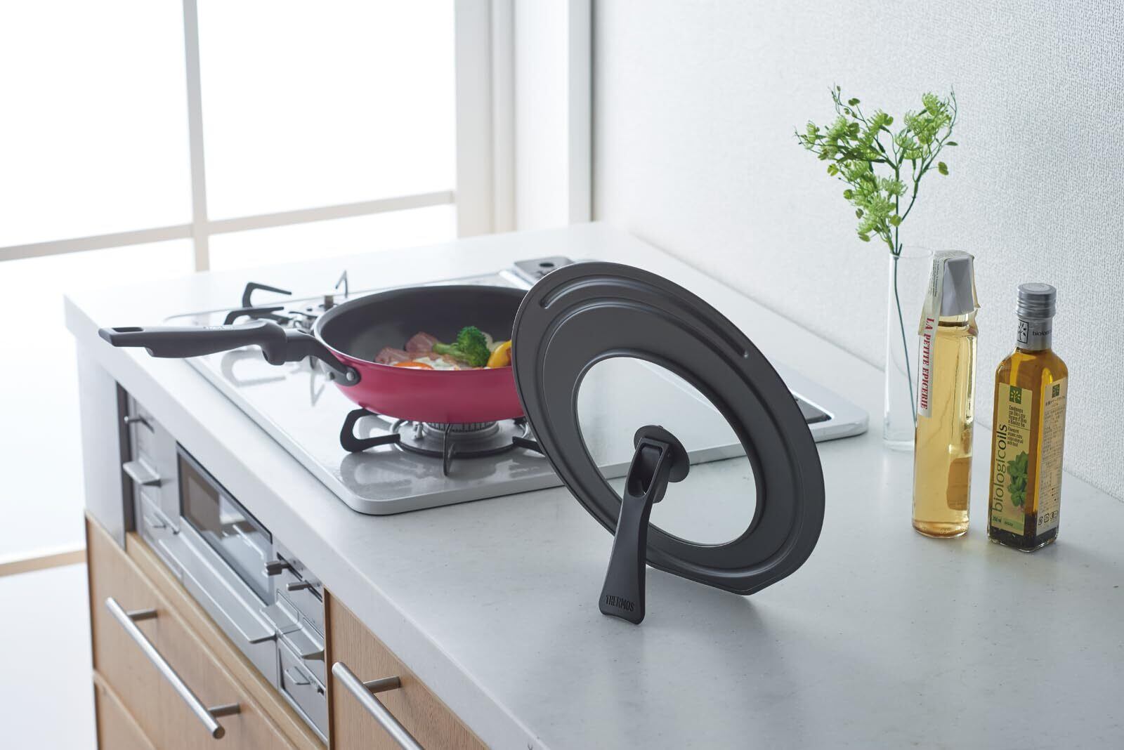 収納に便利な折りたためるフライパンフタ。自立するから調理中に便利。