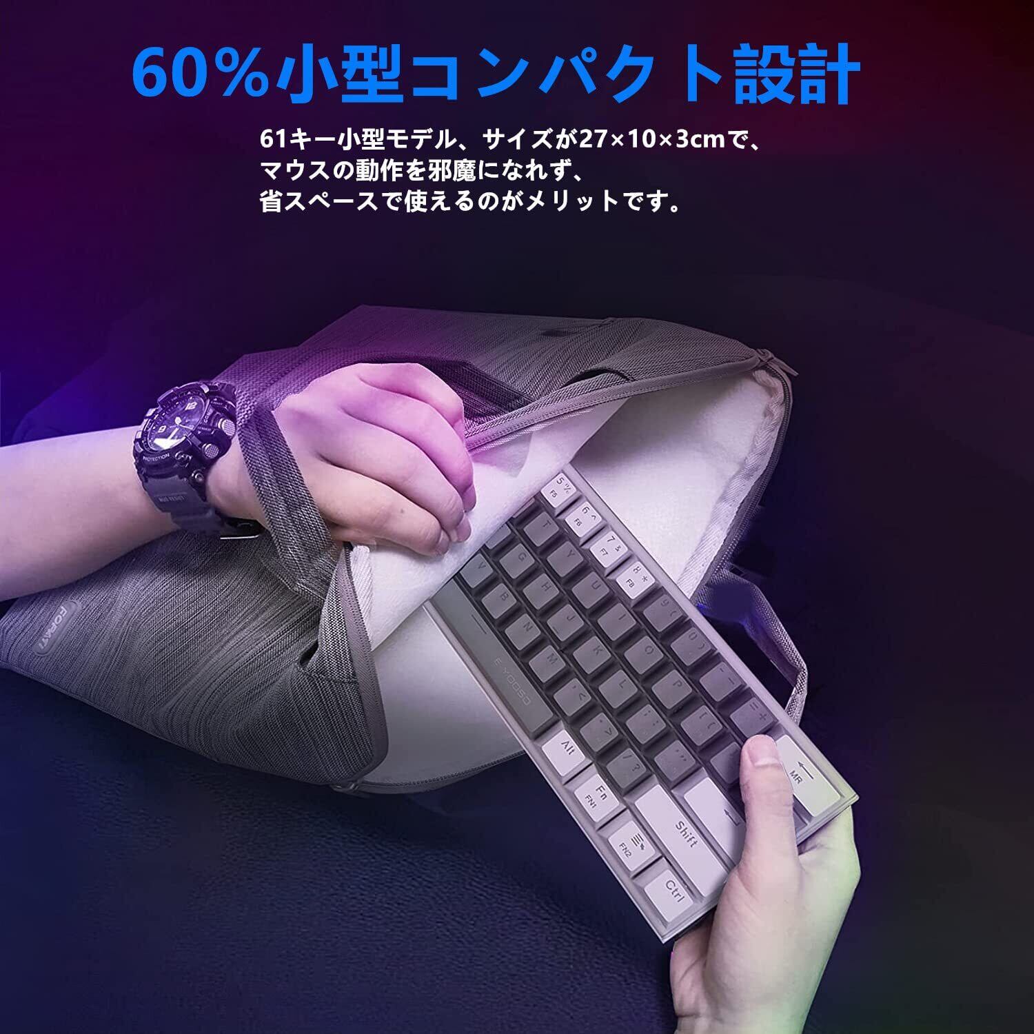 ️【61キーロールオーバー・コンパクトなサイズ】▶ 全61キー無衝突。各キーが独立キースイッチを採用し、1つのキーに対して1つの機械式スイッチと金属製のバネ(スプリング)を組み込む特殊な構造です。61キーを同時に押せても干渉されず、意図通りに入力できます。メンブレン式キーボードに比べ、耐久性に優れ、打ち心地が絶品と評判が高いです。キーの感触にこだわりのあるユーザーや着実なキー入力が求められるヘビーゲーマーに最高。61キー小型モデル、サイズが27×10×3cmで、マウスの動作を邪魔になれず、省スペースで使えるのがメリットです。