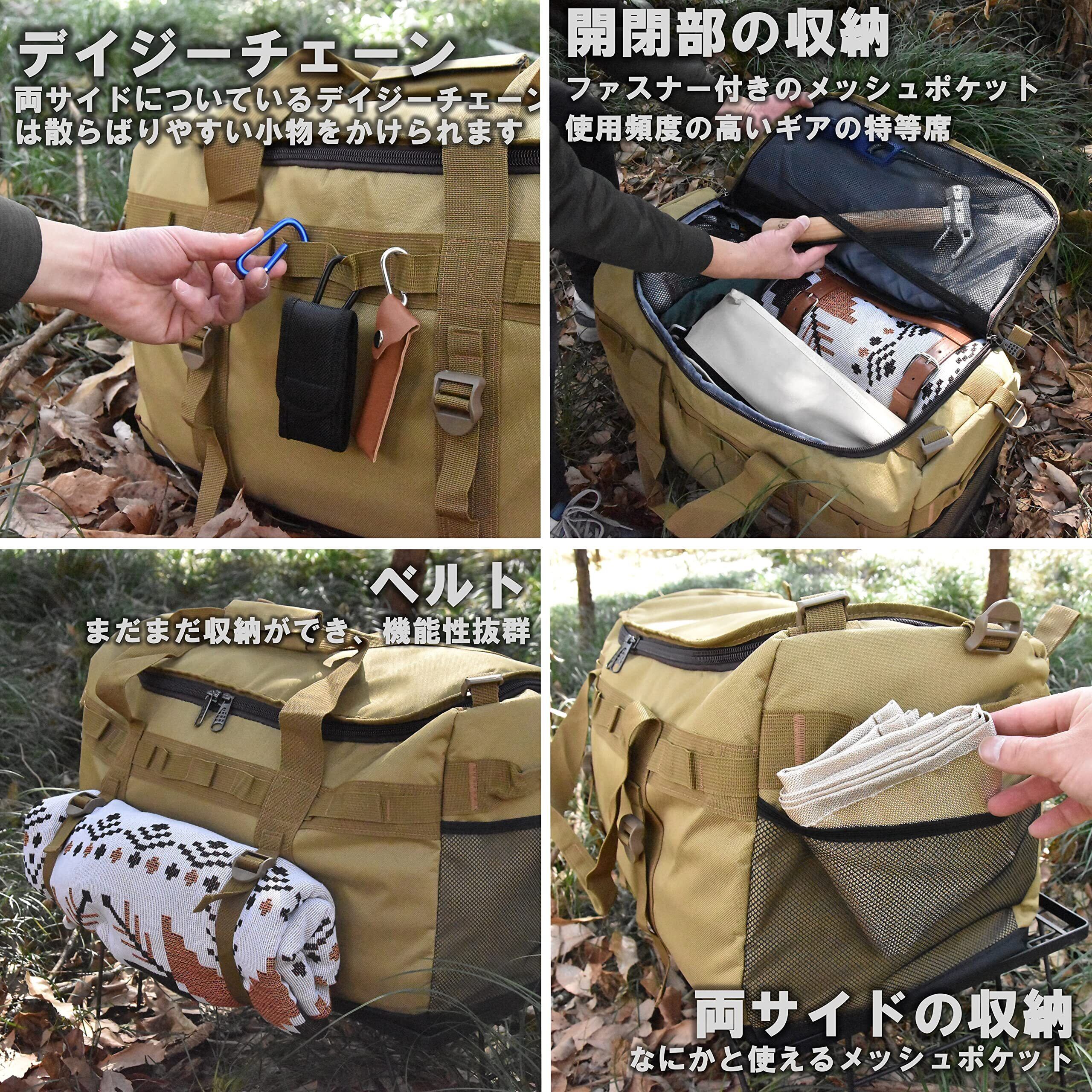 【大容量収納】約53Lの収納力を誇ります。キャンプ道具などアウトドア全般、旅行時の荷物などを収納できる大型アウトドアバッグです。汚れに強く、引き裂き強度の強いナイロン製オックスフォード生地を使用。側面にはクッションが内蔵されており、多少のごついギアをいれたりできます。開口部の裏にはメッシュタイプのファスナー付き収納があるため、小物の収納に最適です。