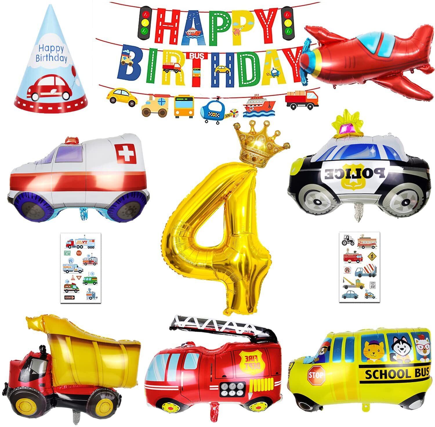 【セット内容】①8個のホイルバルーン:【大きめ】トラック×1、【大きめ】飛行機×1、【大きめ】スクールバス×1、【大きめ】パトカー×1、【大きめ】消防車×1、【大きめ】救急車×1、【大きめ】数字バルーン×1、王冠×1 ②車ステッカー(ランダム 2個) ③ 1セットお誕生日おめでとうバナー ④説明書(日本語) ⑤小道具キット(リボンひも) ⑥三角帽子×1