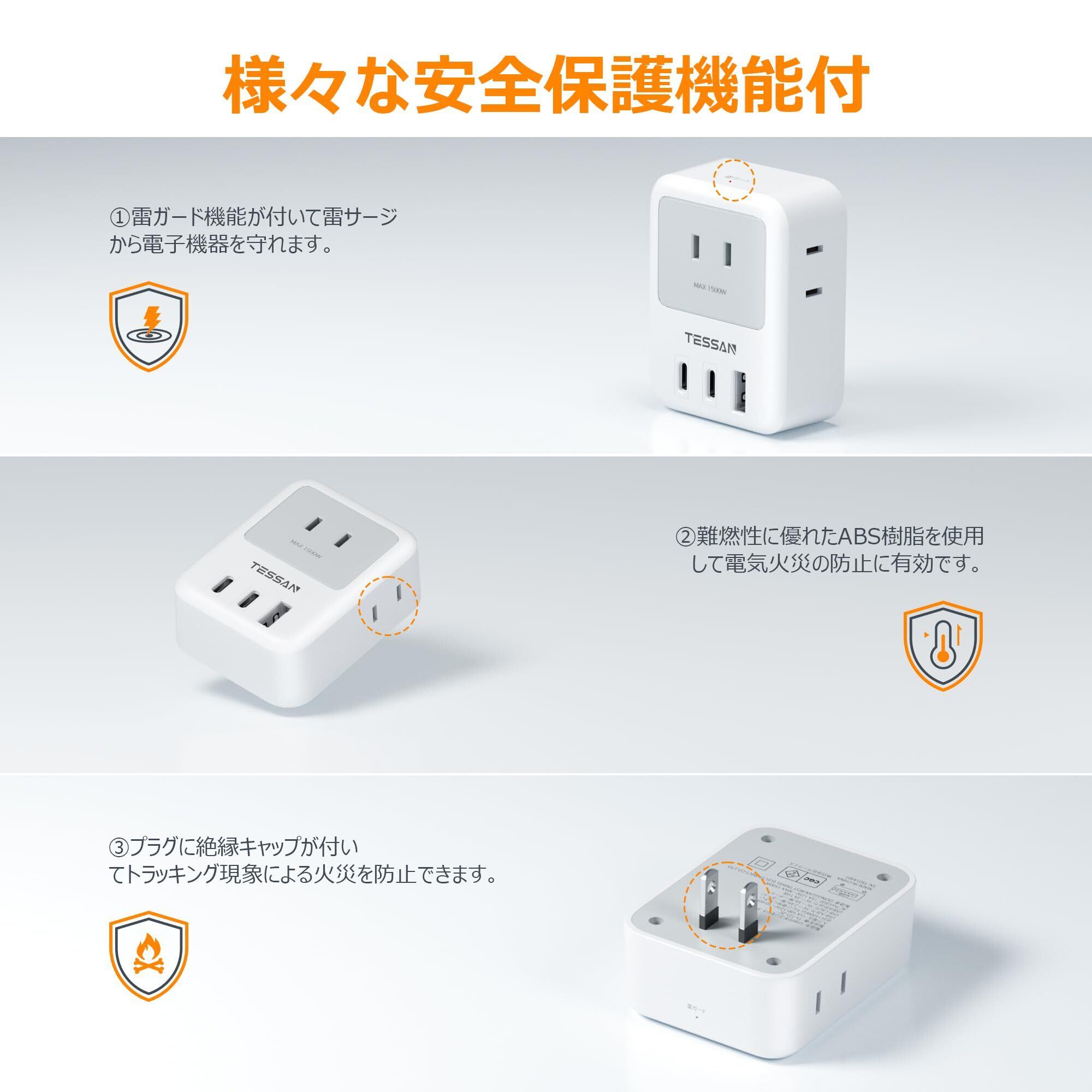 「安全保護機能付の電源タップ」:このusb c タップは本体が難燃性に優れたABS樹脂を採用して、安心に使用されます。また、2ピン式のACプラグの根本には、絶縁キャップが付いて、トラッキングの防止に有効です。なお、雷ガード機能が搭載されていて、雷サージから電子機器を守れます。