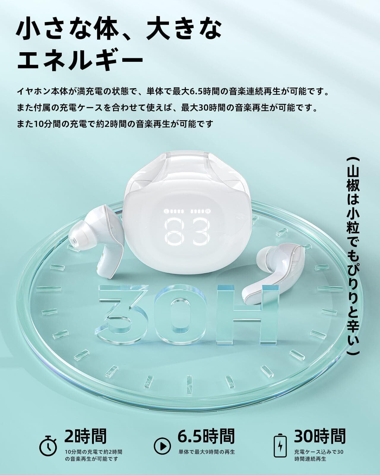 【本体音楽再生6.5時間&ケース併せて最大30時間再生&片耳でもお楽しみいただけます&簡単操作】イヤホン本体が満充電の状態で、単体で最大6.5時間の音楽再生が可能です。また付属の充電ケースを合わせて使えば、最大30時間の音楽再生が可能です。また10分間の充電で約2時間の音楽再生が可能です。充電ケースはUSB-C高速充電にも対応します。(※再生可能時間は、音量、再生する内容、使用環境によって異なります)左右のイヤホンの単独使用と両耳での使用を簡単に切り替えることができます。※片耳使用時は、もう片方のiPhoneイヤホンを充電ケースに戻します。感度が良いタッチボタンを搭載され、スマホを取り出さずに音楽再生/一時停止/曲送り/曲戻し/電話受け・拒否・SIRI(音声ガイダンス)などを簡単にイヤホンの操作ができ、オンライン会議、運転や家事、荷物配達などの忙しい場合もスマホを取り出す必要なく、ひと指で全て実現できます。