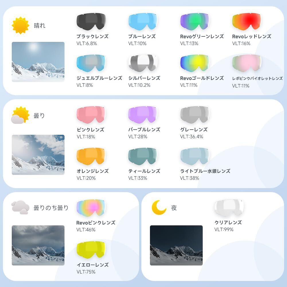 【高性能ダブルレンズ】:スキーゴーグルは高度なダブルレンズ構造を採用。❄️日本製インナーレンズは耐久性のある防曇素材と特殊コーティング加工技術を採用。レンズ間には断熱効果を高めるためのエアギャップがあり、効果と性能はイタリアのレンズよりも優れています。❄️レンズの外側には防水コーティング技術を採用し、氷や雪がレンズに付着するのを防ぎます。❄️また、超硬技術で作られたアウターレンズは、耐擦傷性を向上させることができます。上部と下部のフルチャンネルベントは、レンズ内部の熱放散のために設計されています。❄️新鮮な外気を吸い込み、内部の暖かく湿った空気を排出し、理想的な空気の流れを制御し、曇りを防ぎます。優れた耐引っかき性、二重の防曇性、100%のUV保護、および耐風性を備えています。