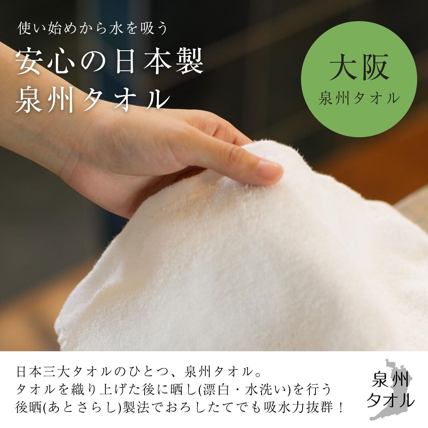 【伝統ある泉州産タオル】 日本のタオル産業発祥の地である、大阪・泉州で生産されたタオルです。 泉州タオルは、糸に付いた糊や油を洗い流し白くきれいにする「晒し」工程を、タオルが織り上がった後に行う「後晒製法」が特徴の一つ。 これによって清潔で吸水力にも優れたタオルが出来上がります。