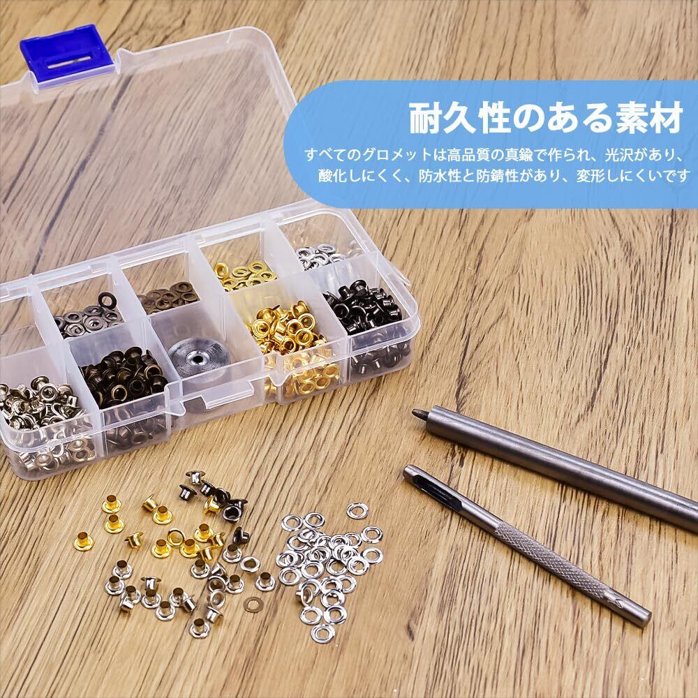 【パッケージの内容】:パッケージにはアイレット400セット+工具3点(パンチ+取付棒+台座)+収納ボックスが含まれています。カラーはゴールド、シルバー、ブロンズ、ガンブラックの4色、各色100セットずつで、カラーマッチングのニーズにお応えします。