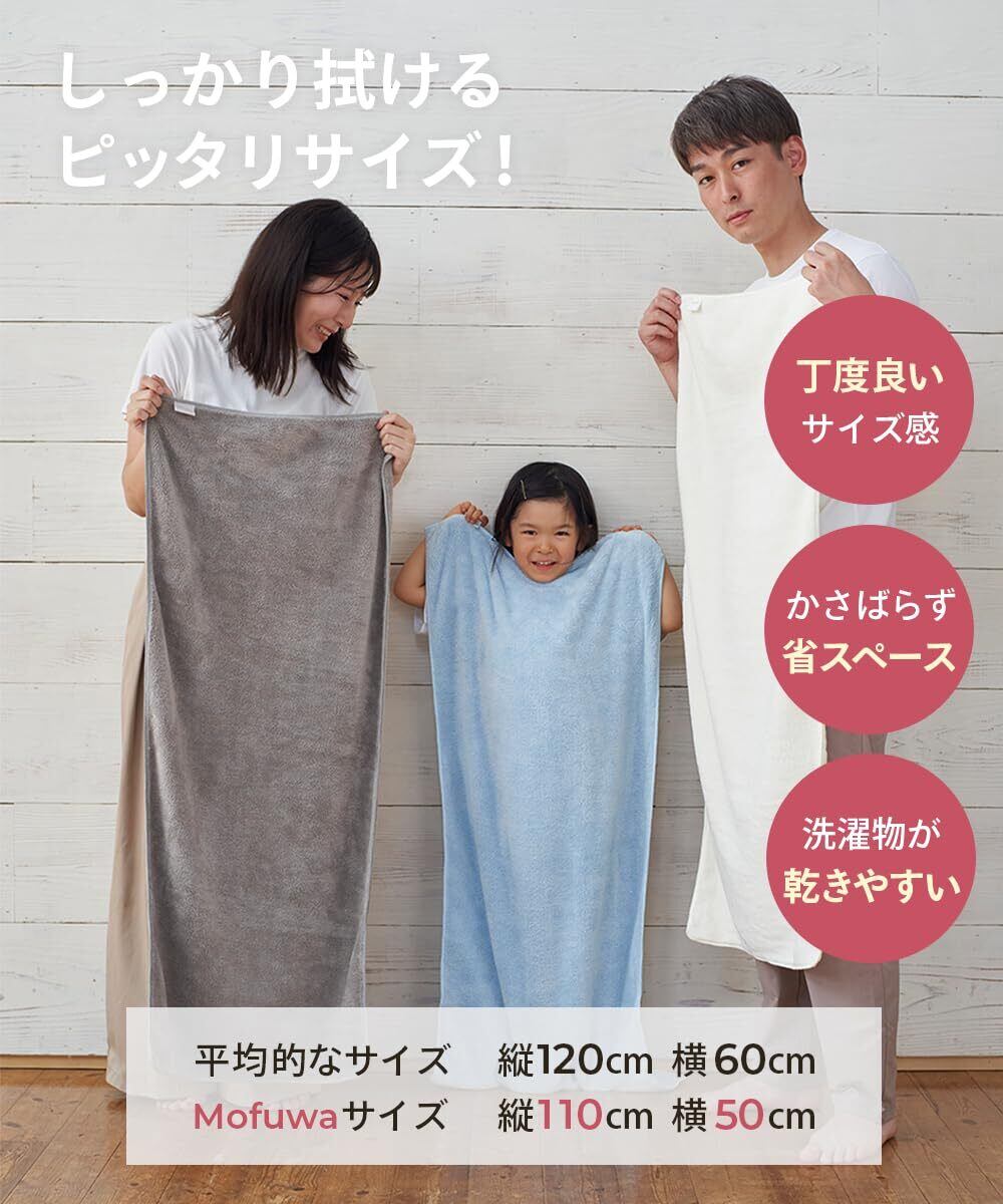 コンパクトサイズで効率的 Mofuwaバスタオルは110cm x 50cmのコンパクトサイズですが、吸水性が高く、体全体をしっかりお拭き頂けます。コンパクトなのでかさばらないのも特徴です。