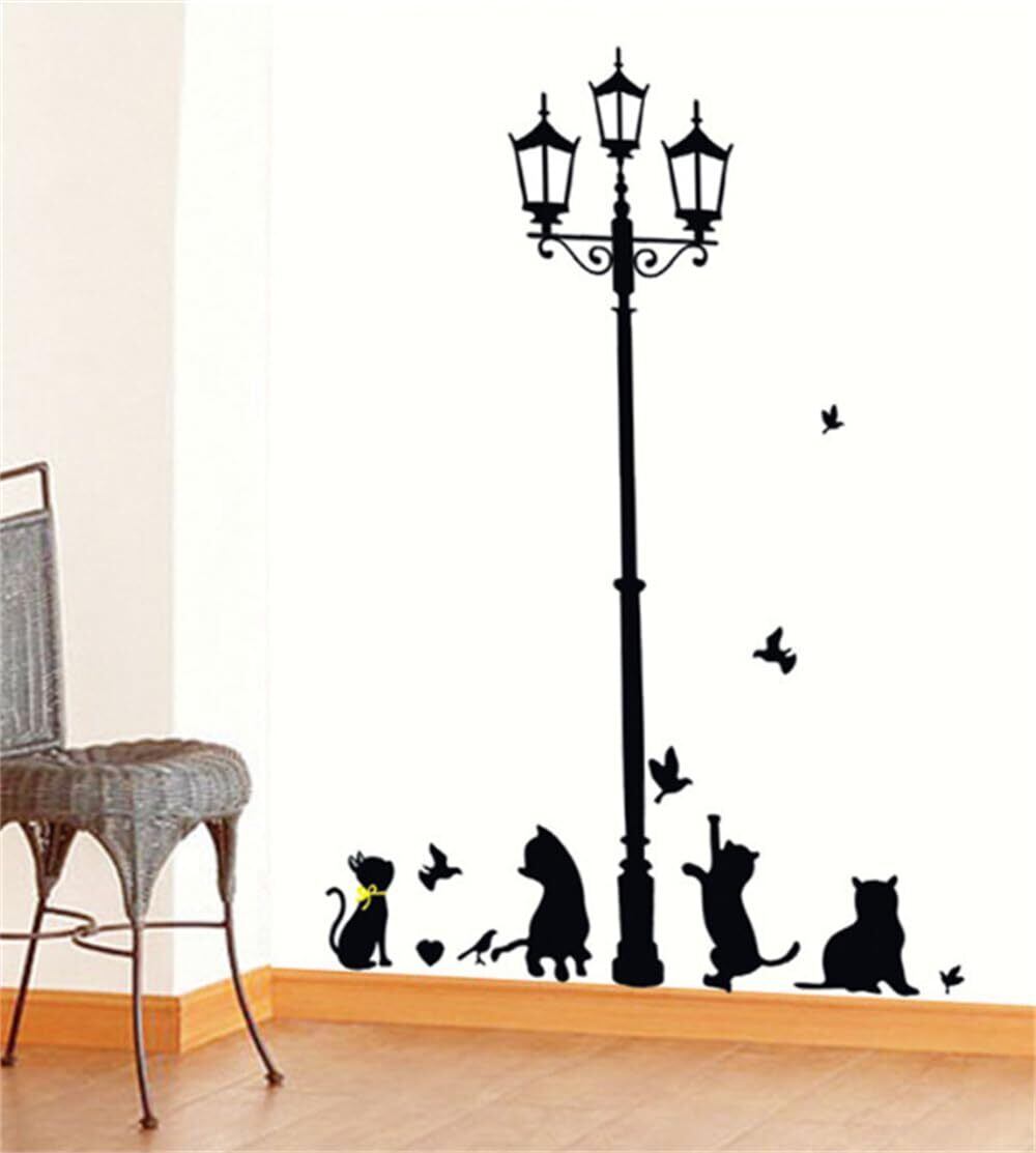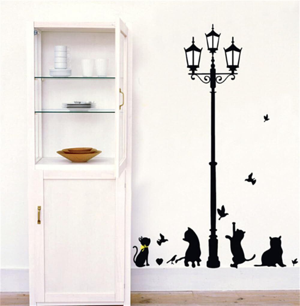Condessacity ウォールステッカー おしゃれ 街灯 ブラック モノトーン 猫 ウォール ステッカー 可愛い 猫 シール 鳥を捕まえる猫 ウォールシール 壁紙シール はがせる 御洒落 リビングルーム 賃貸 ベッドルーム 子供部屋 剥がせる ウォールペーパー