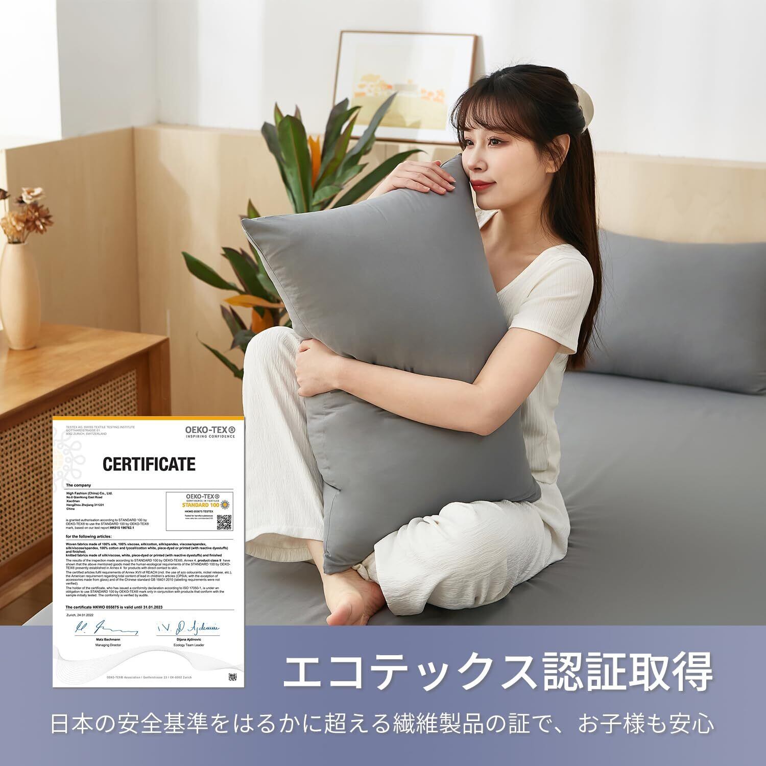 <安全の認証マーク>:300種類以上の有害物質を対象とした、世界最高水準の安全な繊維製品の証 「エコテックススタンダード100」認証を取得。
