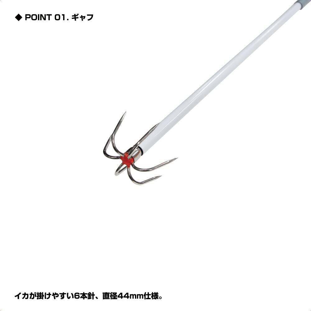 穂先は視認性に優れたホワイト塗装、ギャフはイカを掛けやすい6本針。機動性にも優れた小継仕舞39cmで着脱式カラビナが付属し、携行性抜群。ランガンエギングの必須アイテムと言っても過言ではない便利グッズです。