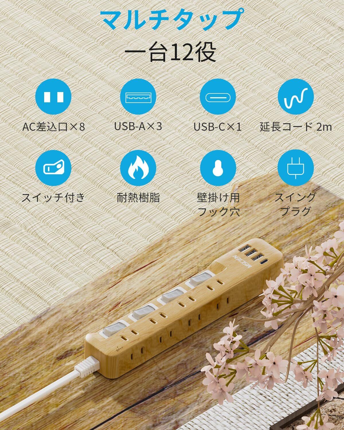 Mscienエムサイン 延長コード 2m 電源タップ usb付き 雷ガード 8AC口 3usb-a 1usb-c マルチタップ スイッチ たこあしコンセント 分岐 oa テーブルタップ スイングプラグ 壁掛け 木目調 蛸足コンセント