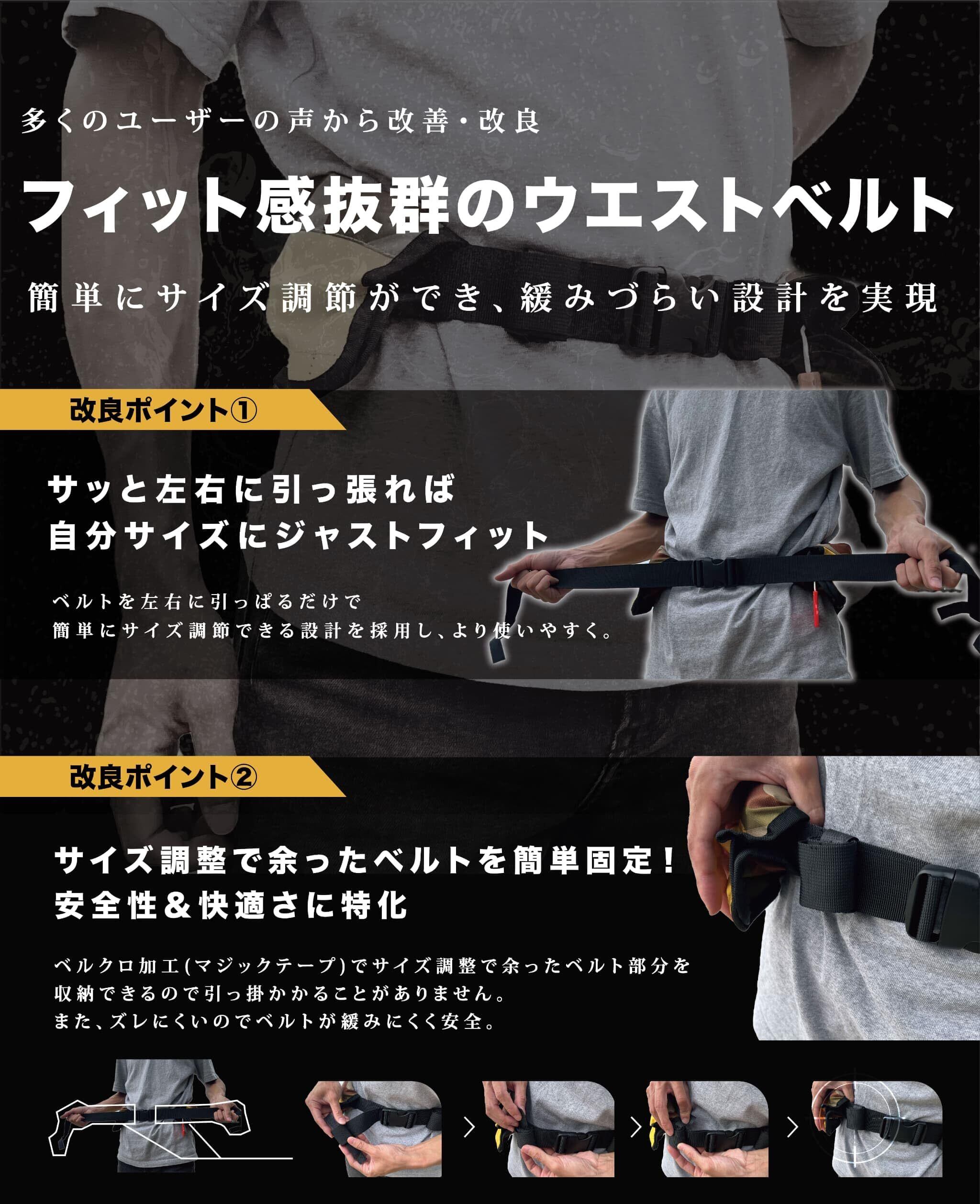 ウエストベルトを引っ張るだけで締められるように改良、余った紐をベルクロで留められるよう改善!