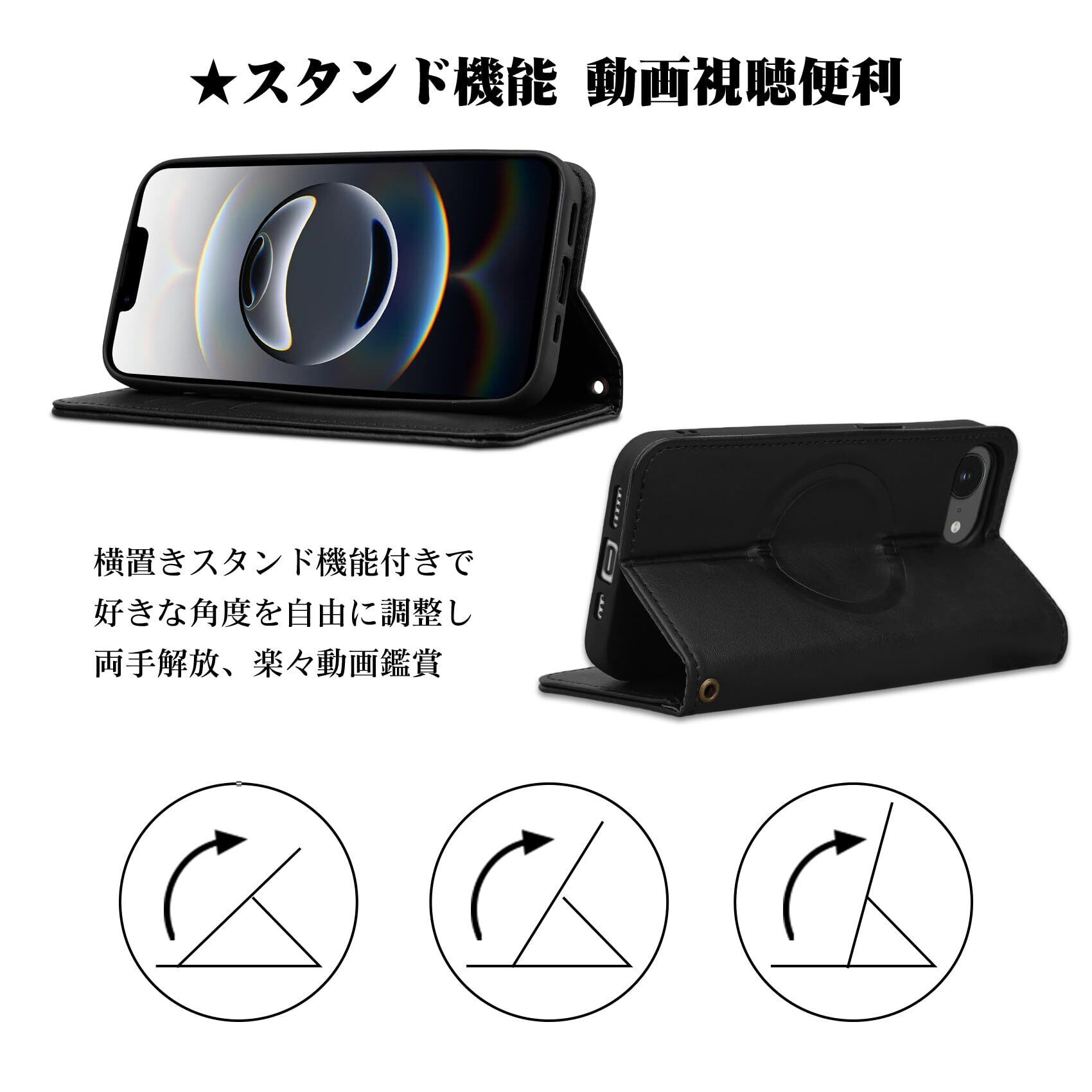 スタンド機能:スタンド機能付きのiPhone 16e 手帳型カバーで、横置きにして角度調整が可能です。動画視聴やビデオ通話、オンライン会議などに快適にお使いいただけます。