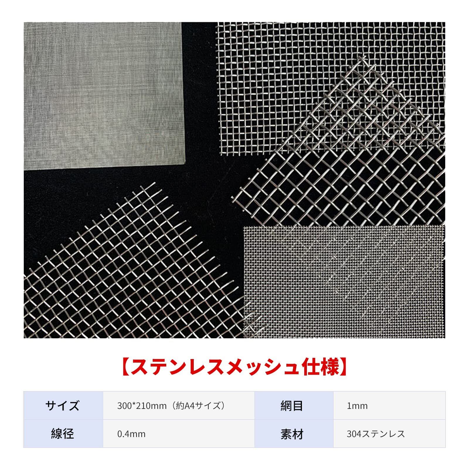 【ステンレスメッシュ仕様】サイズ:300*210mm(約A4サイズ)、線径:0.4mm、網目:1mm、素材:304ステンレス、パッケージ内容:20メッシュステンレス平織金網×2枚