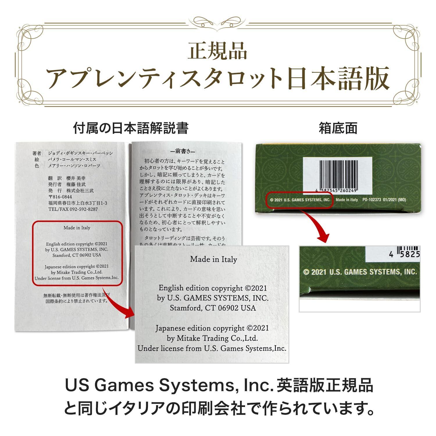 【US Games Systems, Inc.認定 】US Games Systems, Inc.のアプレンティスタロット英語版と同じイタリアの工場で印刷されているため、英語版とカードの品質・絵柄等は全く同じです。