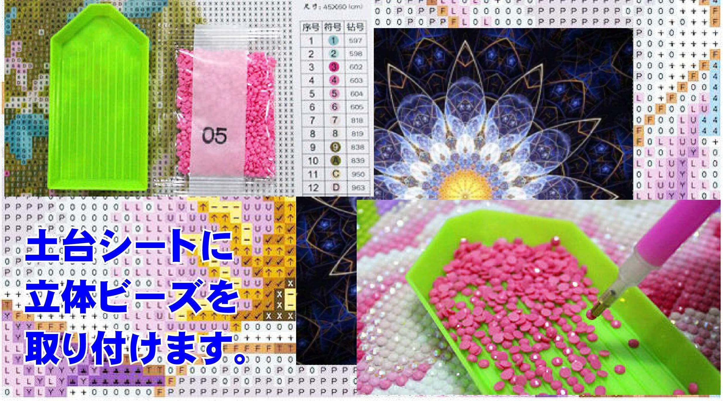 5D ダイヤモンド立体絵画は小さな32面体カットのビーズを、土台シール布に貼り付けて完成させる立体的な絵画の制作キットです。