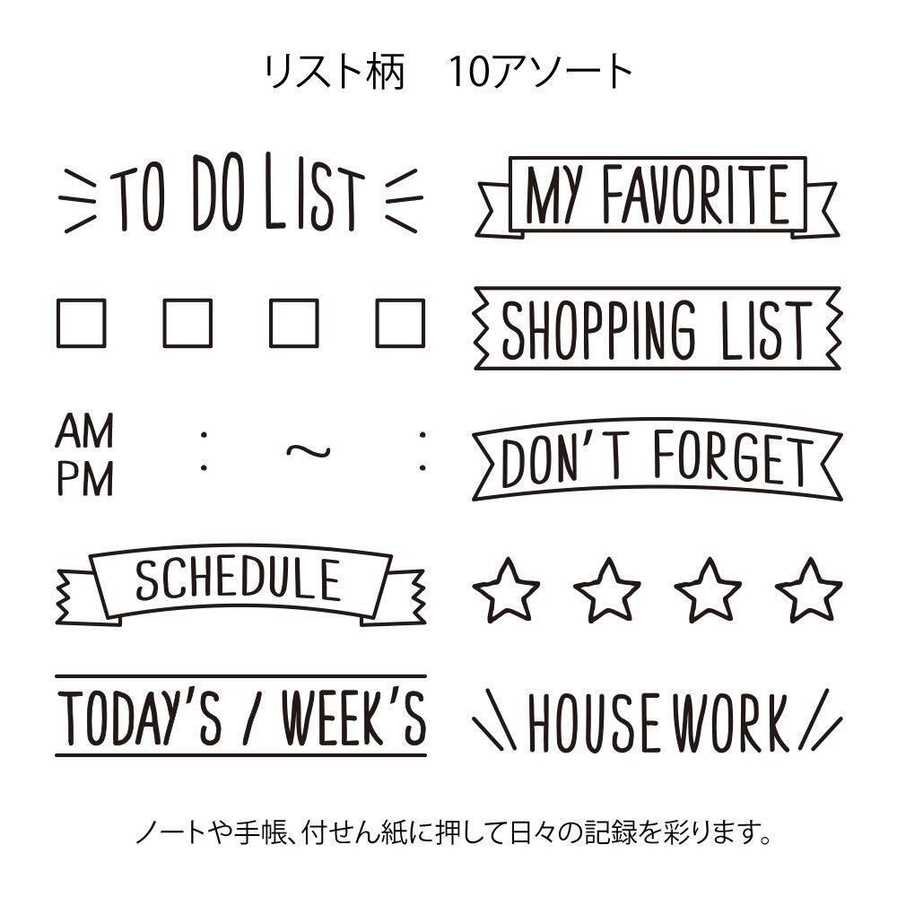 ダイアリーやノート、付箋をかわいくデコレーション! バレットジャーナルにもおすすめな「リスト柄」は、1つのスタンプで「TO DO LIST」や「SHOPPING LIST」などのタイトルと、「星マーク」や「チェックボックス」のイラスト、全部で10種類の柄を切り替えて使用できます。