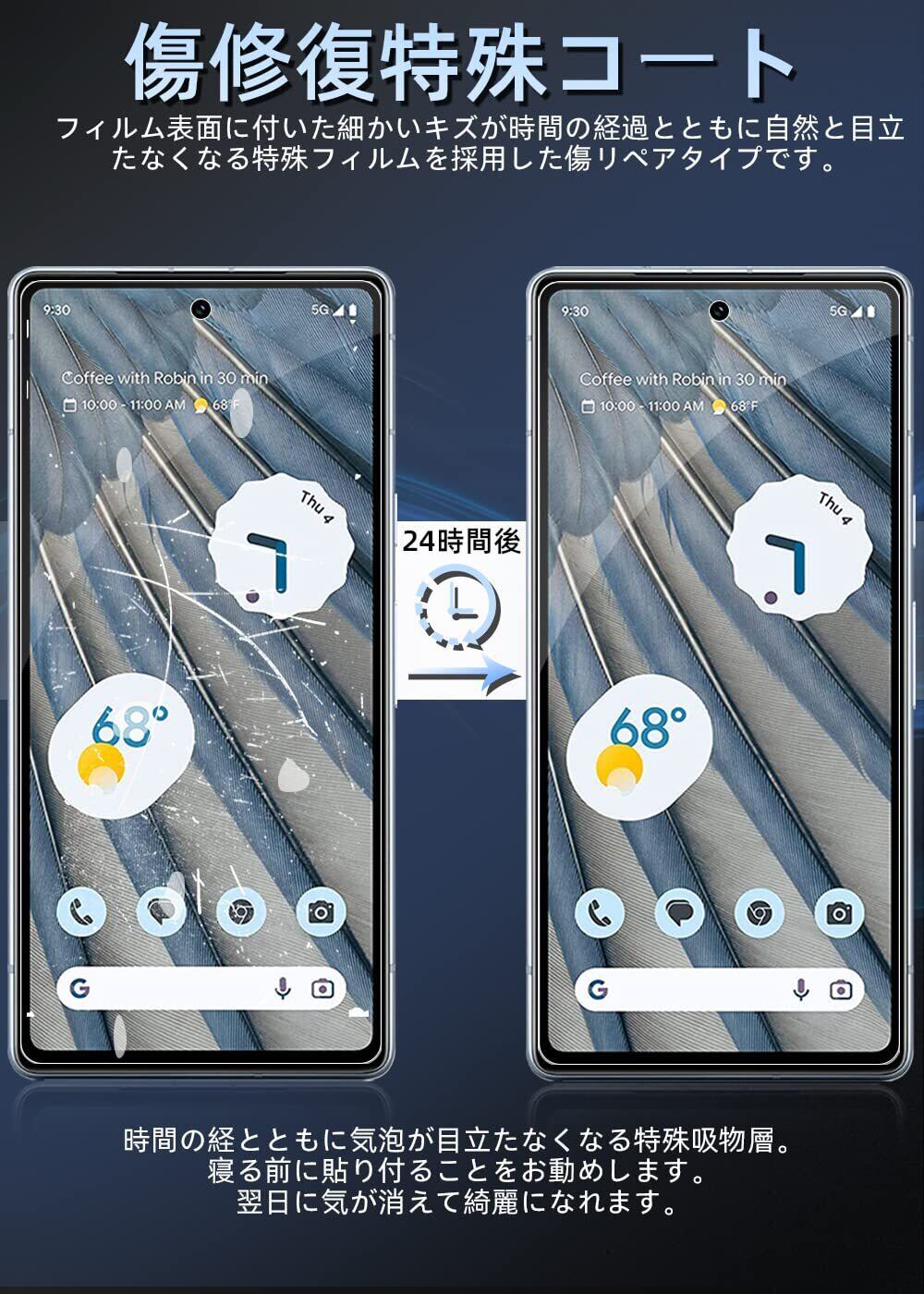 【コーティング表面処理】1.TPE特殊な修復塗装。傷修復性と成形性に優れる自己治癒コートフィルム。日本TPU製フイルム材料は普通のガラスチック製のフィルムより強靭性があり、48時間以内に小さな傷を自動修復し、自然に消えます。2.MPV汚れを防止する塗装。『特殊コーティング』により、表面は滑らかです。水滴が玉のように弾くほどの撥水・加工がされ、指紋や汚れなど付きにくく、拭けばすぐに綺麗になり、いつでも画面がツルツルの状態で操作できます。