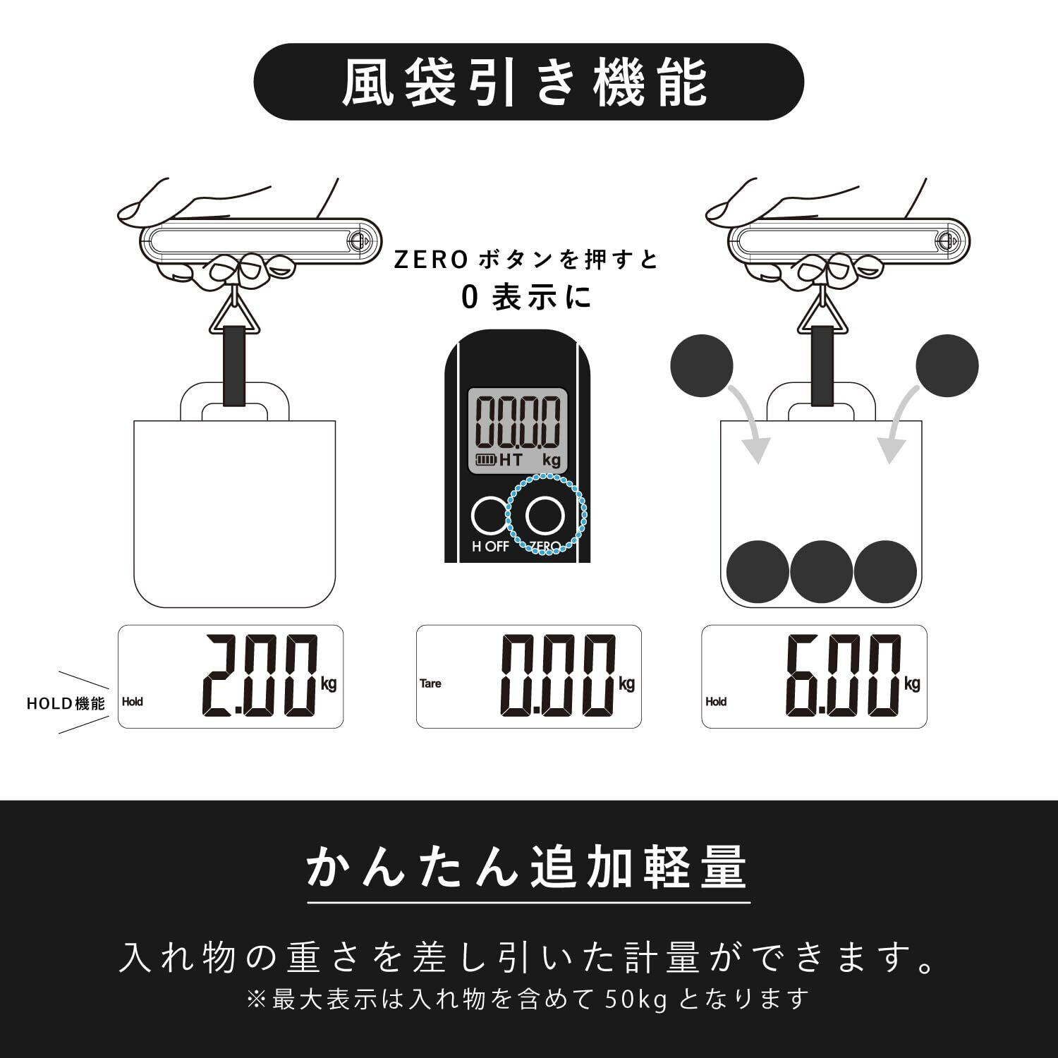 "荷物の重さをボタン押して吊るすだけでサッと計測できるラゲッジスケールです。 飛行機の荷物確認、荷物の送料確認、アウトドアの重量確認、体重計では計測しにくいものの重量確認に役立ちます。"