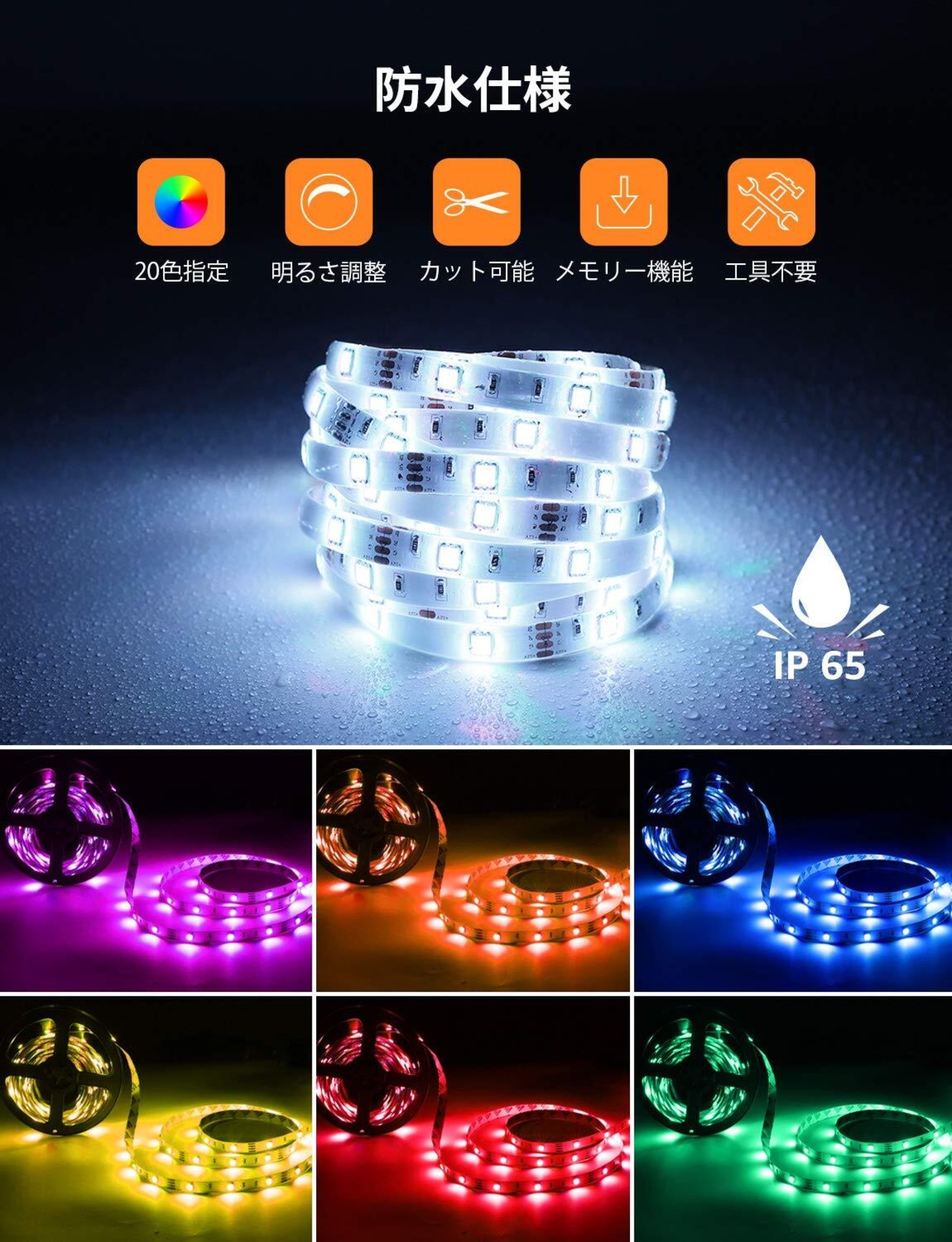 【生活防水仕様】LEDテープライト上にジェルをポッティング保護をしたジェル防水タイプです。水中でのご使用はできません。ご注意:アダプタは防水仕様ではありませんので、防水コンセントには適合しません。