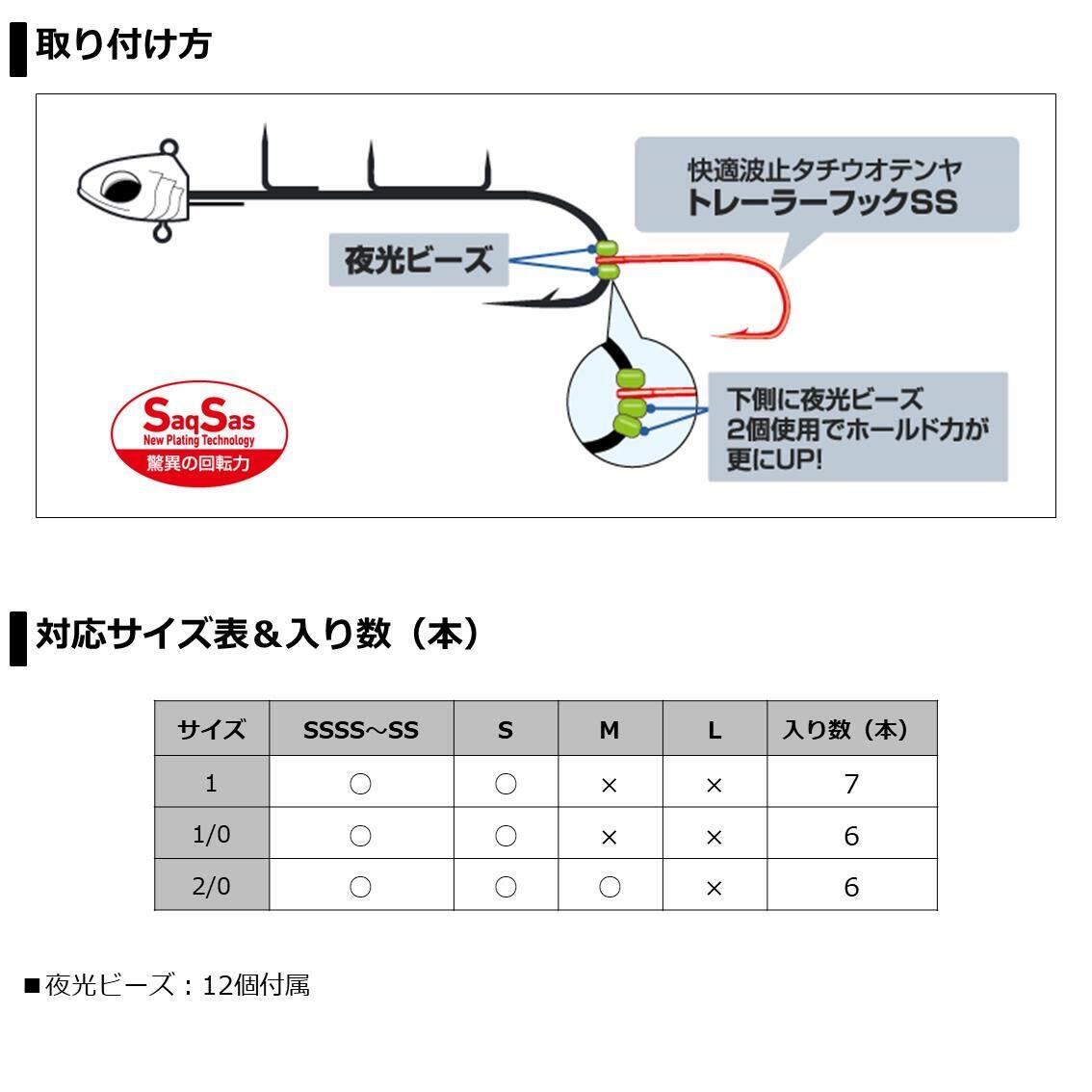 快適波止タチウオテンヤシリーズでさらにフッキングをよくするアイテムです。テンヤに付属の発光玉を通し針をセットし別の発光玉で固定。18年発売の快適トレーラーベイトを合わせて使用いただくとさらにアピール力がアップ! アタリが有るのにフッキングしない状況で強みを発揮します。