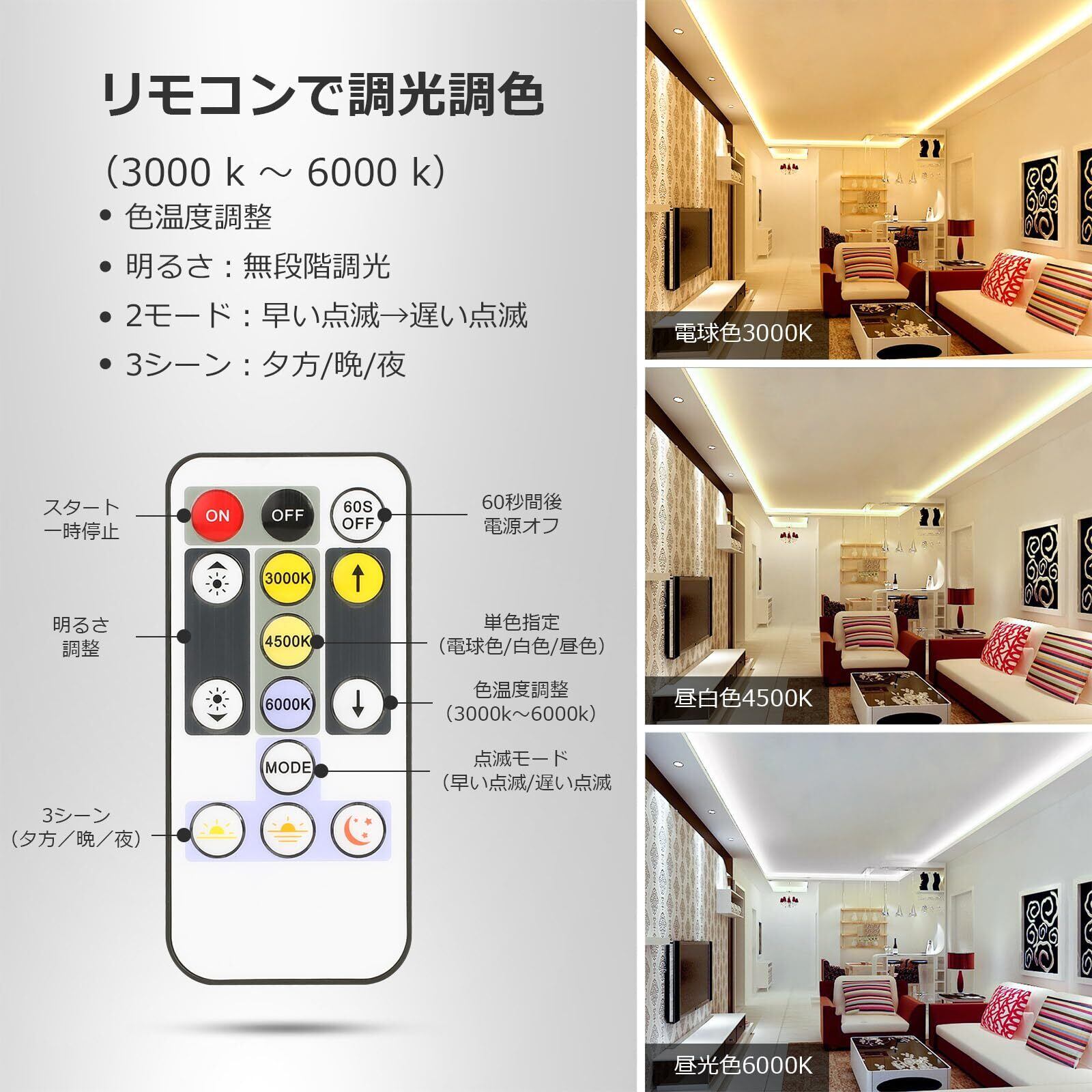 【リモコンで調光調色(電球色・昼白色・昼光色)】幅広く細やかな色温度3000k~6500kまで調整が行えます。完全な白はもちろん、 白よりの電球色や微妙な昼白色、昼光色、温白色も鮮明に実現可能!(ご注意:初使用時、リモコンの絶縁シートを取り外して操作してください。)