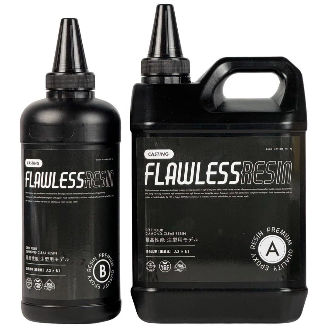 最適な用途 :レジンテーブル、オブジェなどの大きな作品。 標本などの黄変させたくない無色透明の作品など。 ※エポキシ樹脂は硬化時間が長いと表面にシワ模様が発生しやすくなります。更に厚みが薄い、室温が低い、シリコンモールドが柔らかい事なども要因となります。研磨仕上げしない作品の場合は、硬化後・脱枠前に硬化の速いエポキシ樹脂で天面をコーティングするとシワ模様を消すことが出来ます。