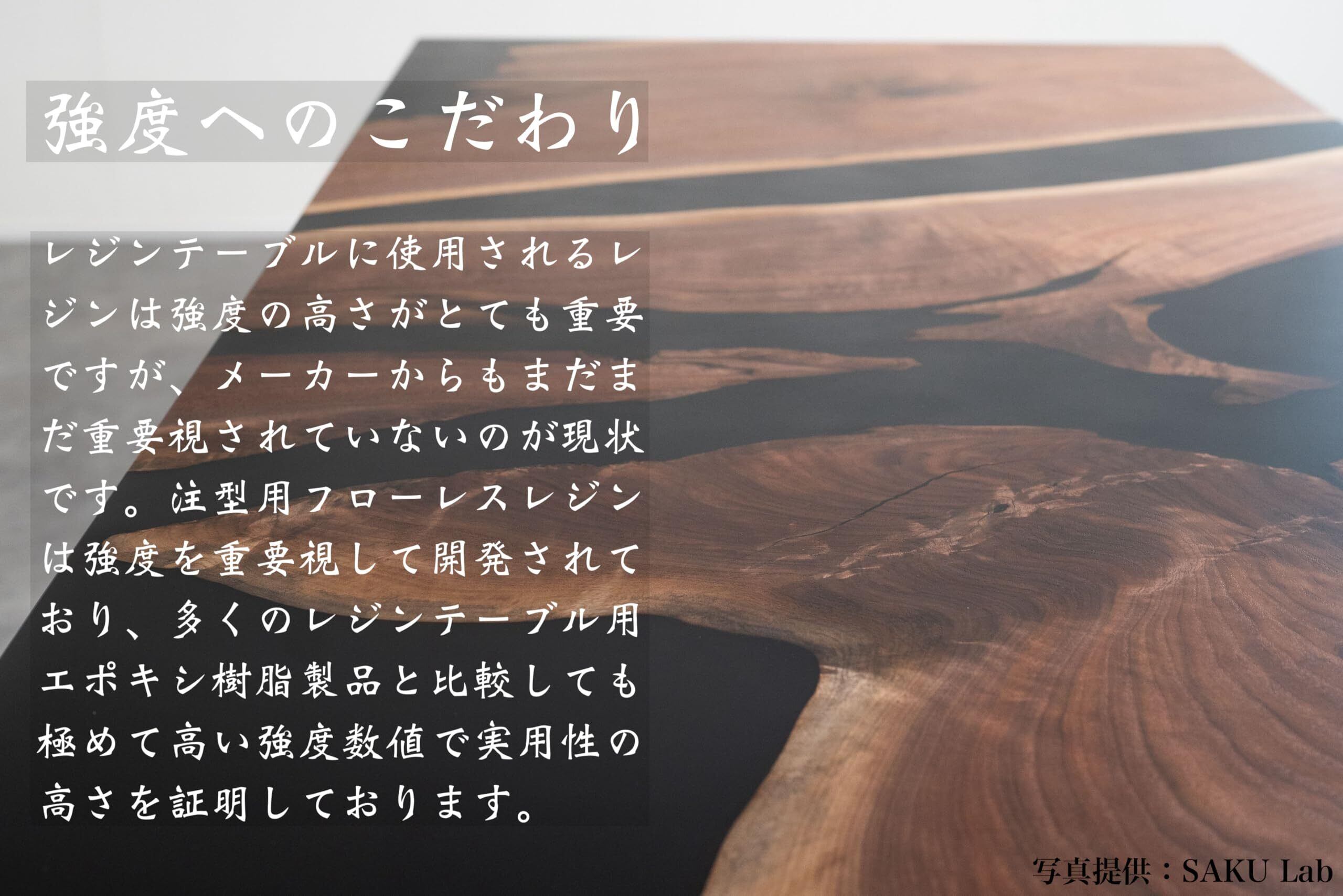 特徴1、レジンテーブルに使用されるレジンは強度の高さがとても重要ですが、メーカーからもまだまだ重要視されていないのが現状です。注型用フローレスレジンは強度を重要視して開発されており、多くのレジンテーブル用エポキシ樹脂製品と比較しても極めて高い強度数値で、実用性の高さを証明しております。