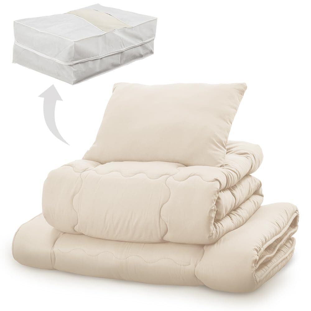 アイリスプラザ すぐ使える&洗える布団4点セット シングル 抗菌防臭 すっきり収納ケース付き しっとりなめらかピーチスキン加工 (掛け布団 敷布団 枕) アイボリー