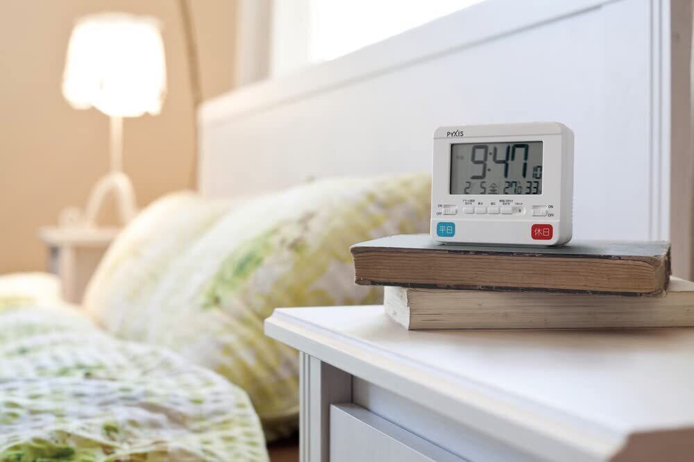 アラームが2種類設定できるから、生活スタイルに合わせて使い分けが可能。温度・湿度もチェックできます。