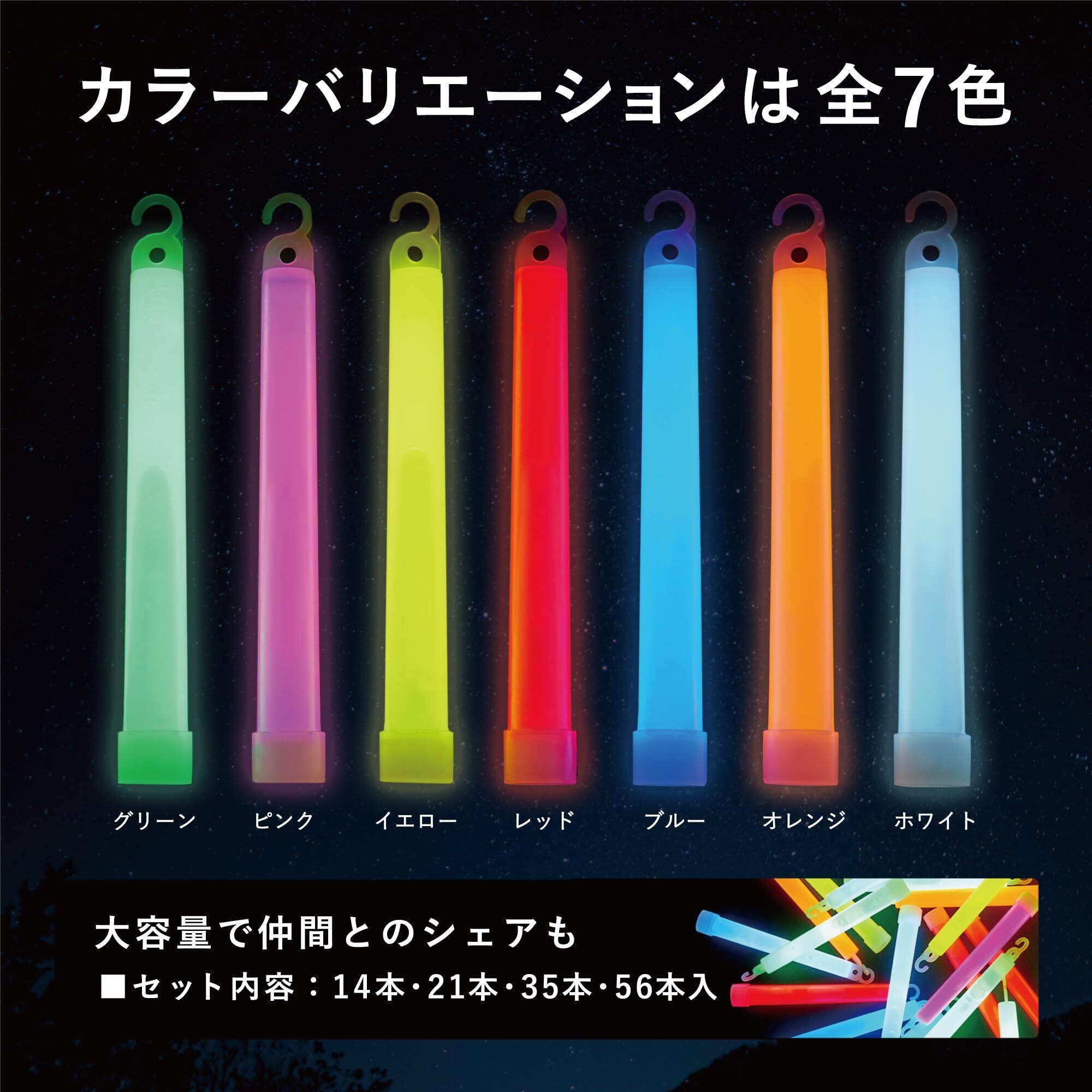 【全7色展開の大容量セット】色は緑・青・黄・オレンジ・ピンク・赤・白の7色。注文のバリエーションも豊富で、ミックス14本(全7色×2本ずつ)、21本(3本ずつ)、35本(5本ずつ)、緑・青は21本または35本、黄・オレンジ・ピンク・赤・白は21本でご購入いただけます。コンサートライト、ペンライトとして仲間にシェアしてルミカライトを楽しもう。ヲタ芸用サイリウム ペンライトにもぴったりです。