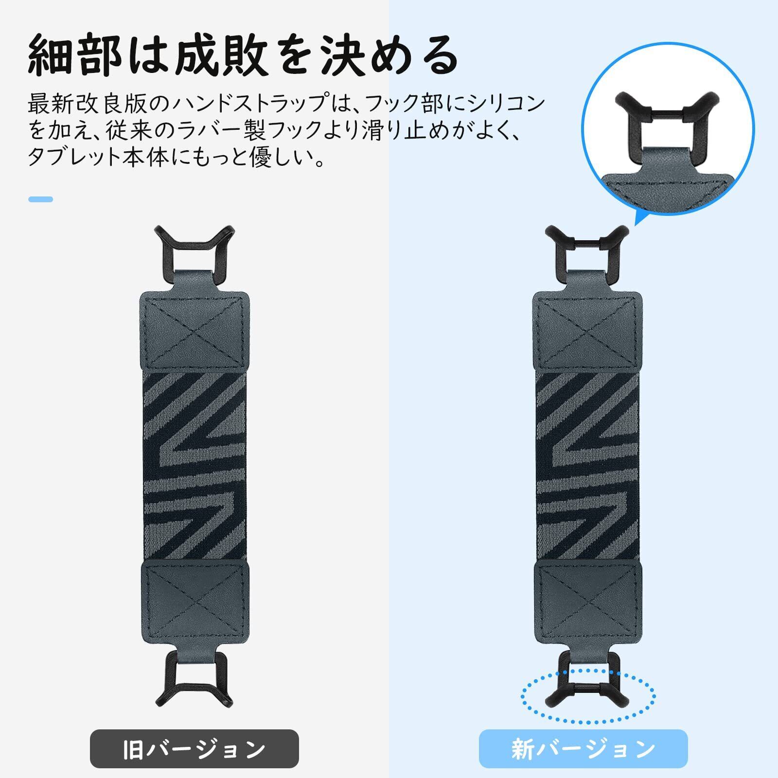 「上質素材採用」 優れた伸縮性がある弾力バンドを採用し、幅広い機種に対応でき、長時間使用しても緩みにくいです。上質なPUレザーを使用してフックの部分と丁寧に縫い合わせて、丈夫で引き裂けする心配は不要です。フックの部分はお客様のご意見を元に改良し、ラバー+シリコンの素材を採用し、タブレットに取り付けても大切な端末に傷つきませんし、滑り止め性能をより一層高め、安心してご利用いただけます。