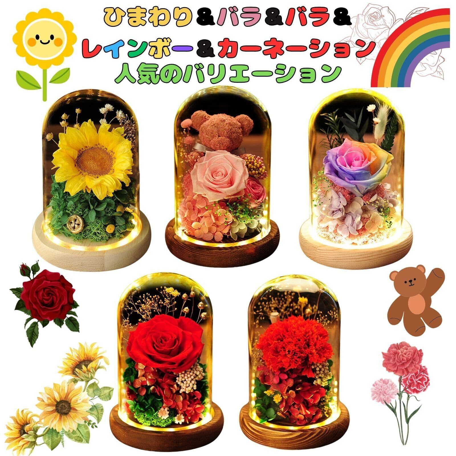 【フローラルフォーエバー】レインボーバラ プリザーブドフラワー 枯れない花 永遠の花 薔薇プレゼント おしゃれ ドライフラワー 可愛い ガラスドーム LEDライト付き 各記念日 手提げ袋 メッセージカード付 奥行き16 cmx 幅16 cmx 高さ22.5 cm (バラwith虹)