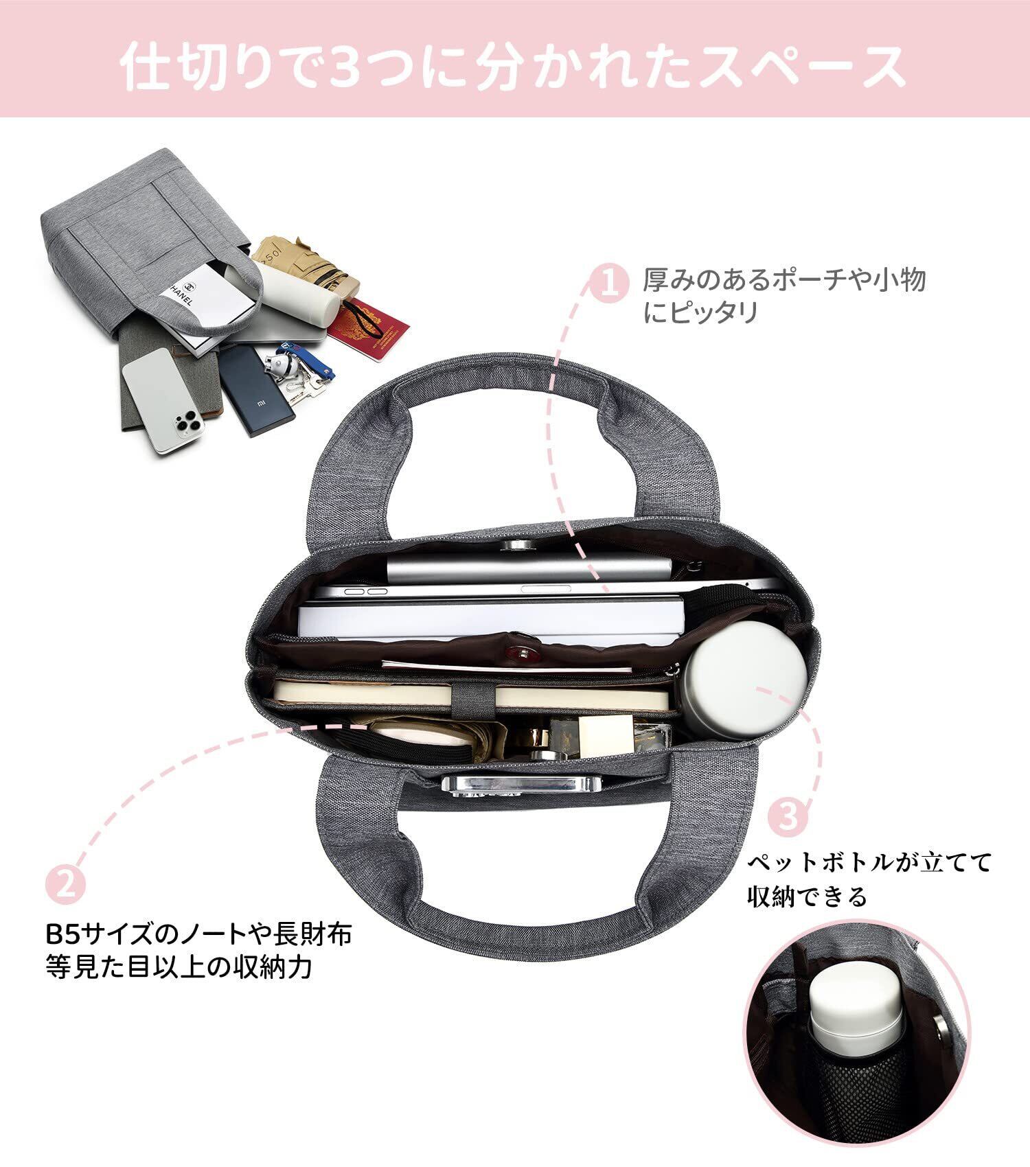 【見た目以上の収納力と機能性】コンパクトだけど収納スペースにはペットボトルが立てて収納できたり、長財布はもちろん、B5サイズノートも収納可能なレディース/メンズ トートバッグです。またお弁当箱など、かさばる荷物が多い日は仕切りを取り外して、普通のトートバッグに変身、ランチバッグにもピッタリです。さらに底板付きで多くの荷物を入れても安定して自立します。