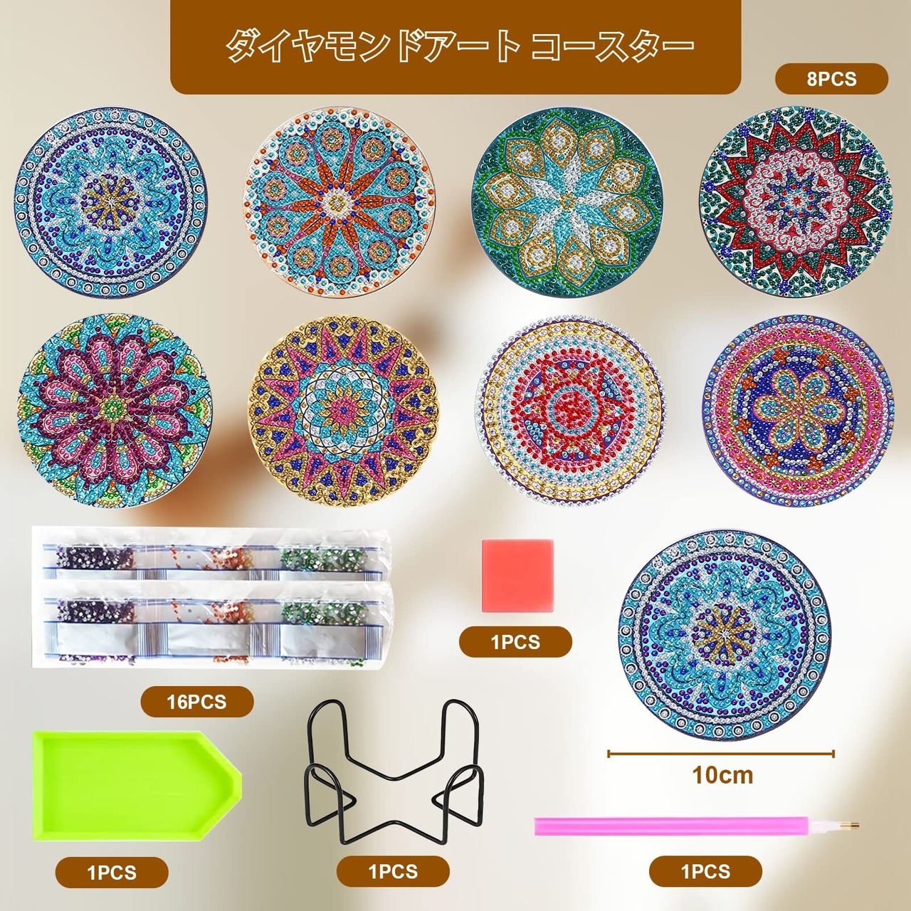【パッケージ内容】多種多様な曼荼羅ダイヤ画アートコースター8枚、支柱1個、カラフルなダイヤ16包(たっぷり、ご自由にお使いください)、粘土接着剤1個、ポイントドリルペン1本。ツールの種類と数はすべてそろっており、手作業の体験感を高めることができます。