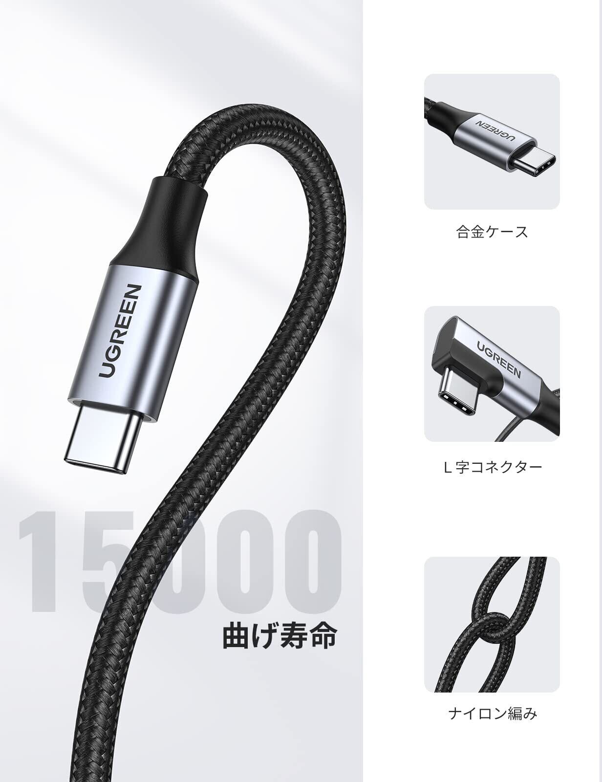 UGREEN L字 USB Cケーブル 映像出力【100W/5A急速充電 USB3.1 PD対応 4K / 60Hz】タイプc ケーブル 5Gbps データコード iPhone 16/15 /PRO MacBook Pro Air iPad Pro Galaxy S23 S22 等type c機種対応 (2M)