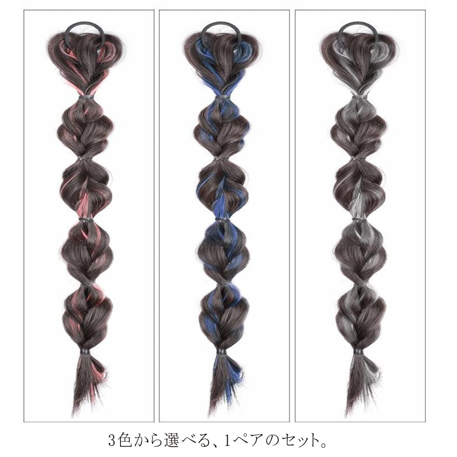 「カラー」黒い髪とカラーの髪を一緒に編んだポニーテール のウィッグは、可愛くておしゃれです。ピンク、グレー、ブルーの3色から選べます。
