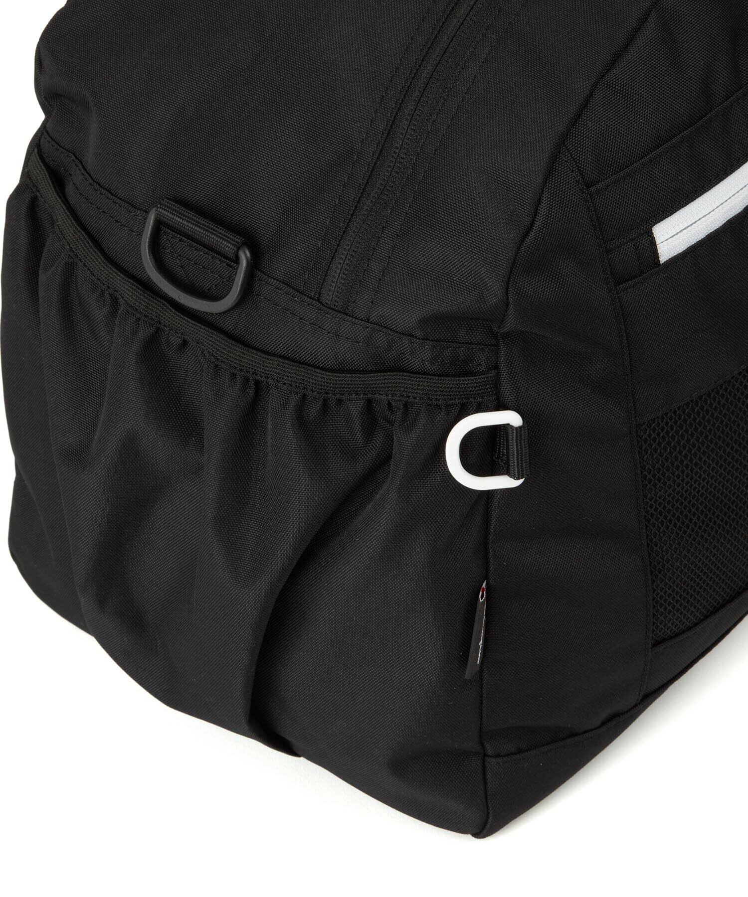 フロントファスナーポケットや、折りたたみ傘やボトル収納に便利なサイドポケット付です。