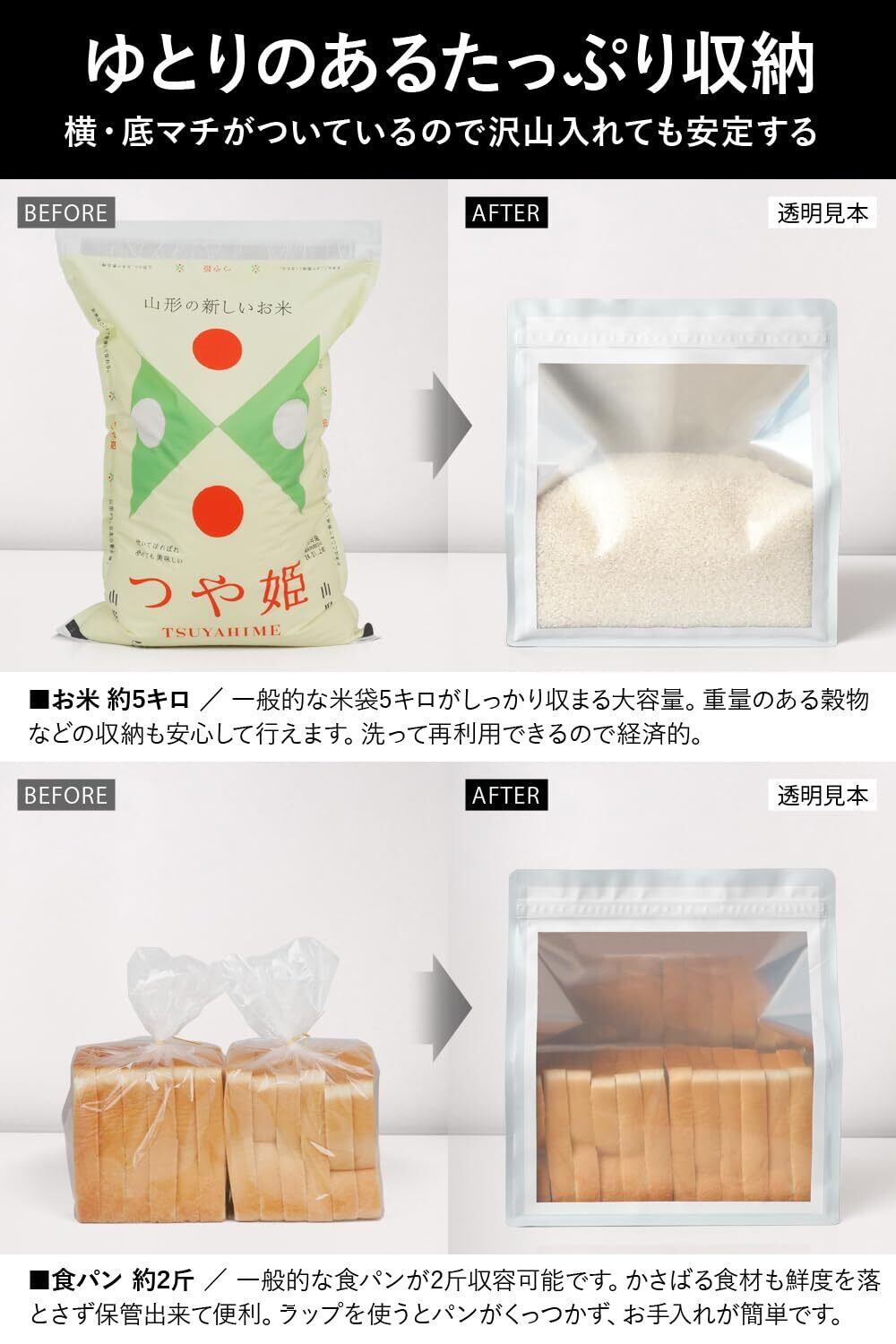ストッカーとしても適しており、食パン袋としては2斤、お米なら約5kgを収納できるため、米びつや食パンケースの代わりにお使いいただけます。様々な食品を酸素・紫外線・湿度から守るので、大豆やコーヒー豆などの豆類、シリアルやパスタなどの主食の保管にも。