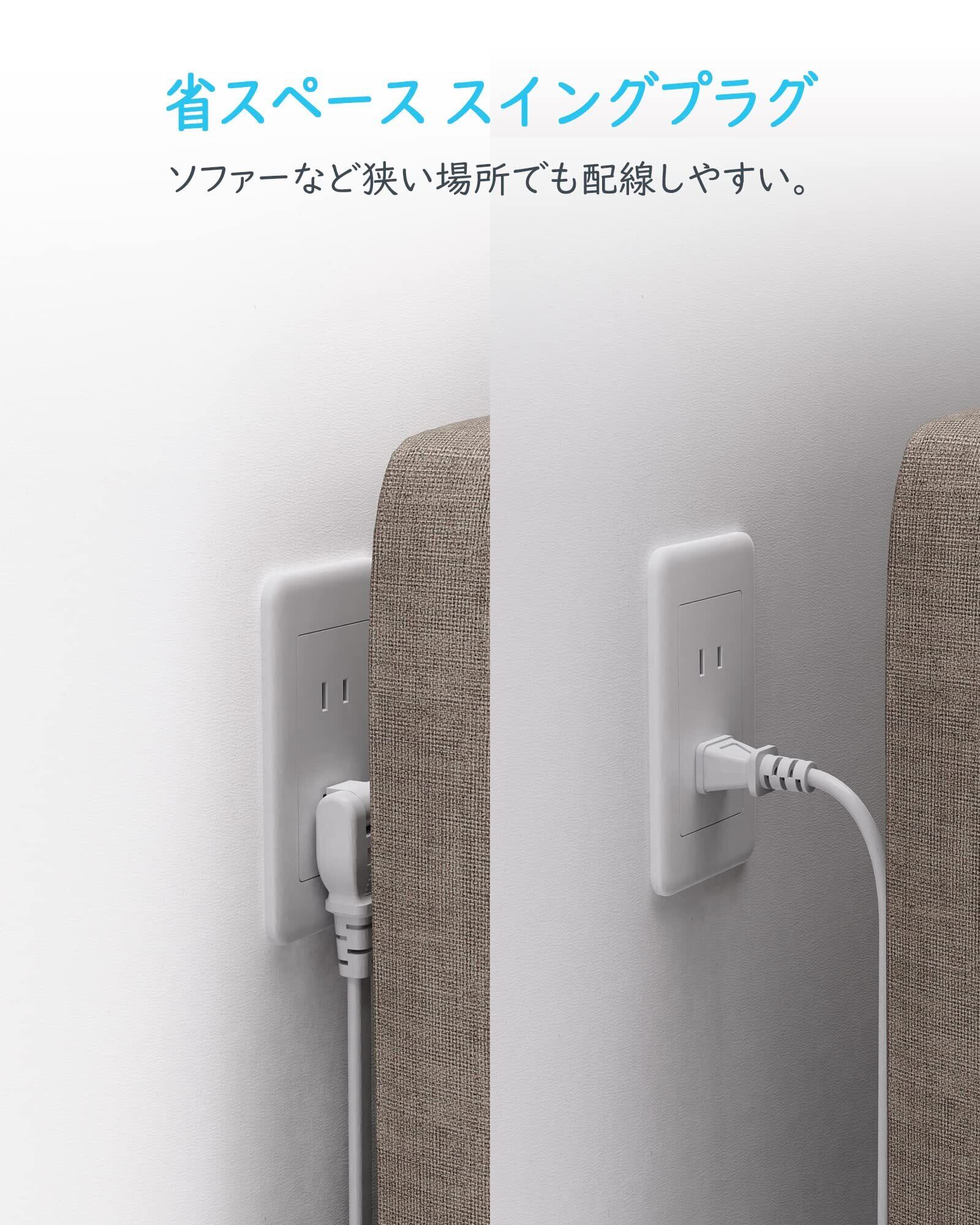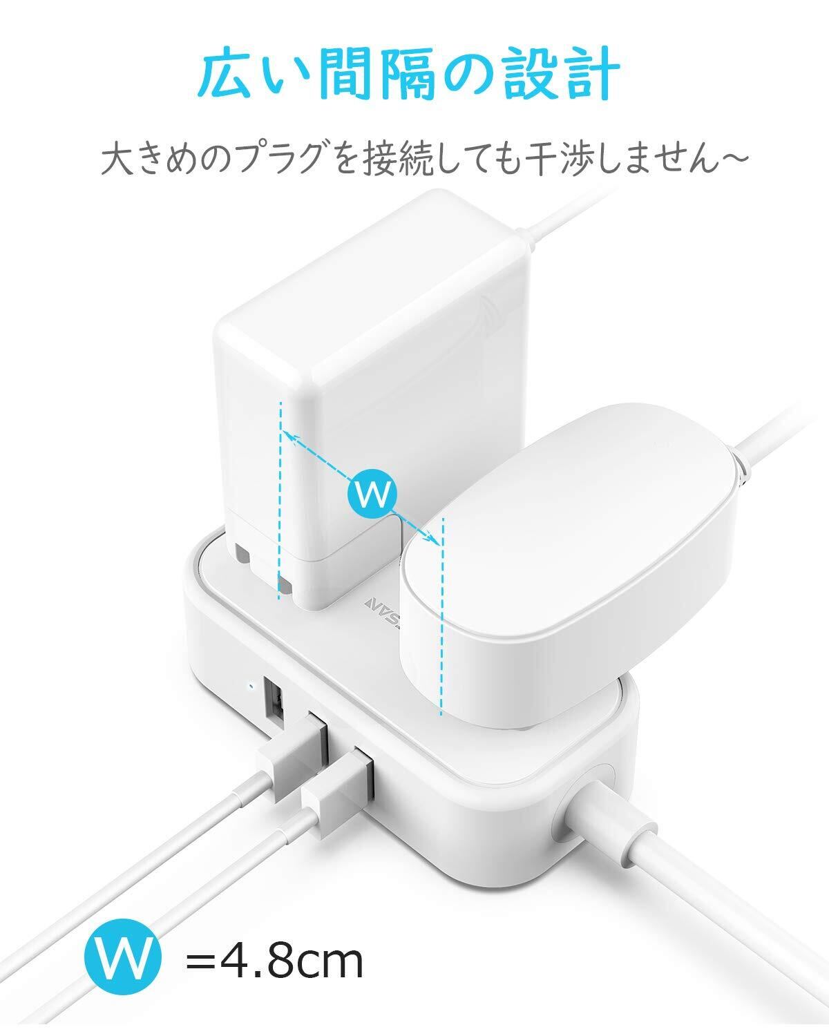 「実用的な延長コード」2口のACコンセントの間隔を広く設計されていて、大きなACアダプタでもすっきり接続できる!それに、ケーブルが綺麗に配線できるよう、USBポートは側面に設計されて、挿すのは便利で使いやすいです。