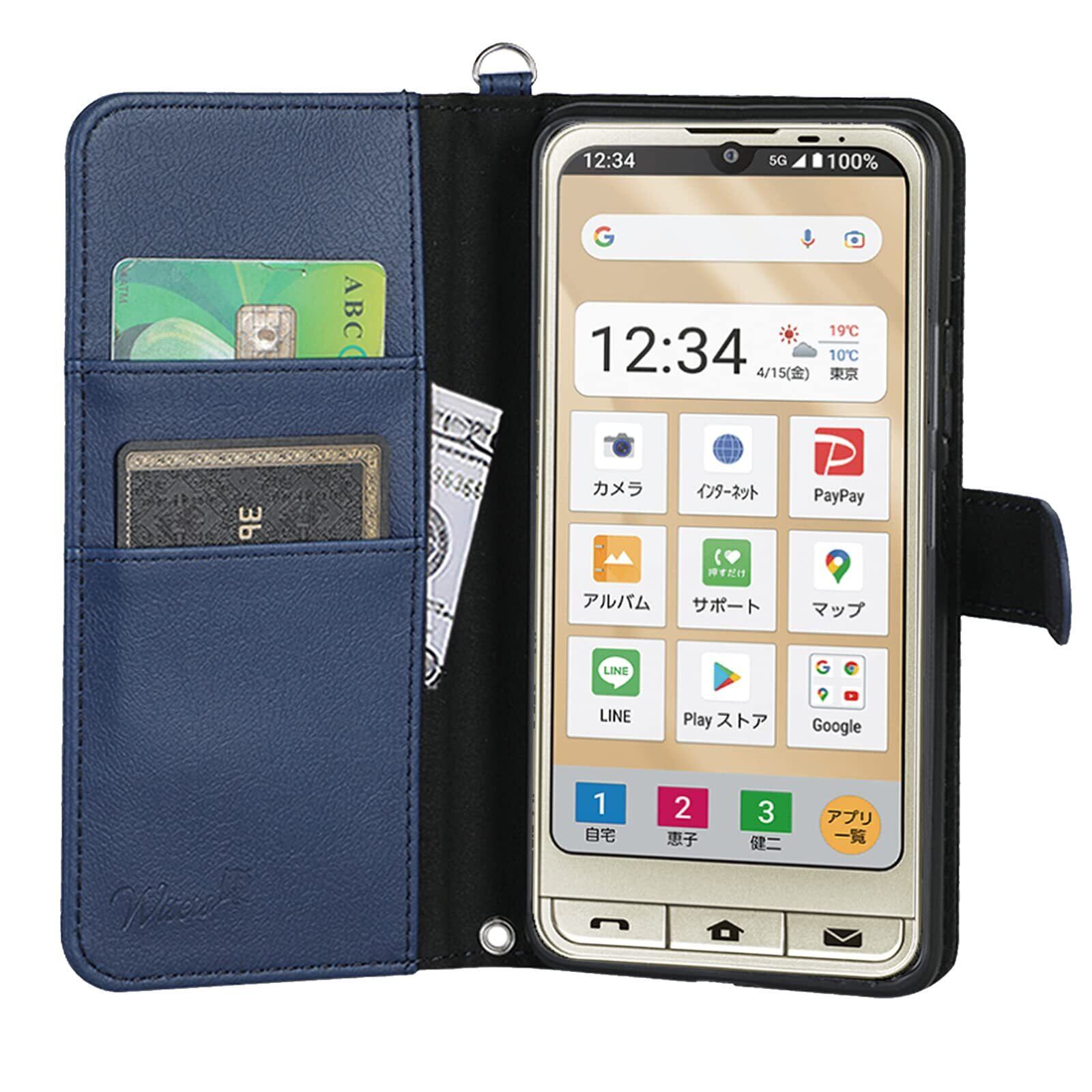 シンプルスマホ6 A201SH シンプルスマホ7 A404SH Basio Active SHG09 Basio Active2 SHG12 対応 手帳型スマホケース (ダークブルー) 牛革調PUレザー (カードホルダー/スタンド機能付き) ストラップ2種付き(ハンドストラップ/ネックストラップ) プレゼント