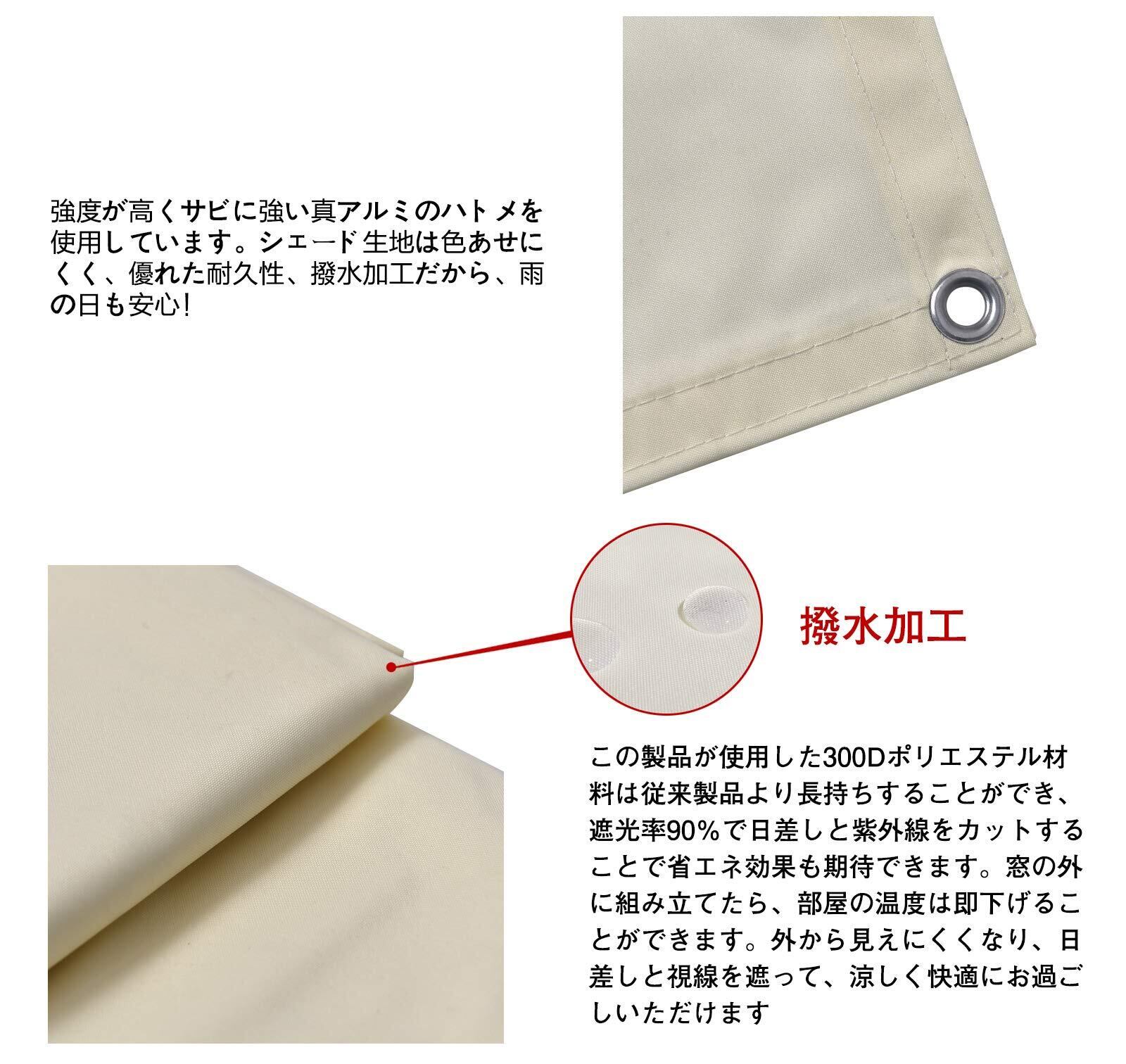 シェードを取り付けることで、室内の温度を下げることができ、省エネ、節電に役立ちます。使わない時は収納できます。カビを防ぐぎ、変形や色色褪せしにくい素材を使用しています。様々な色から選ぶことができます。