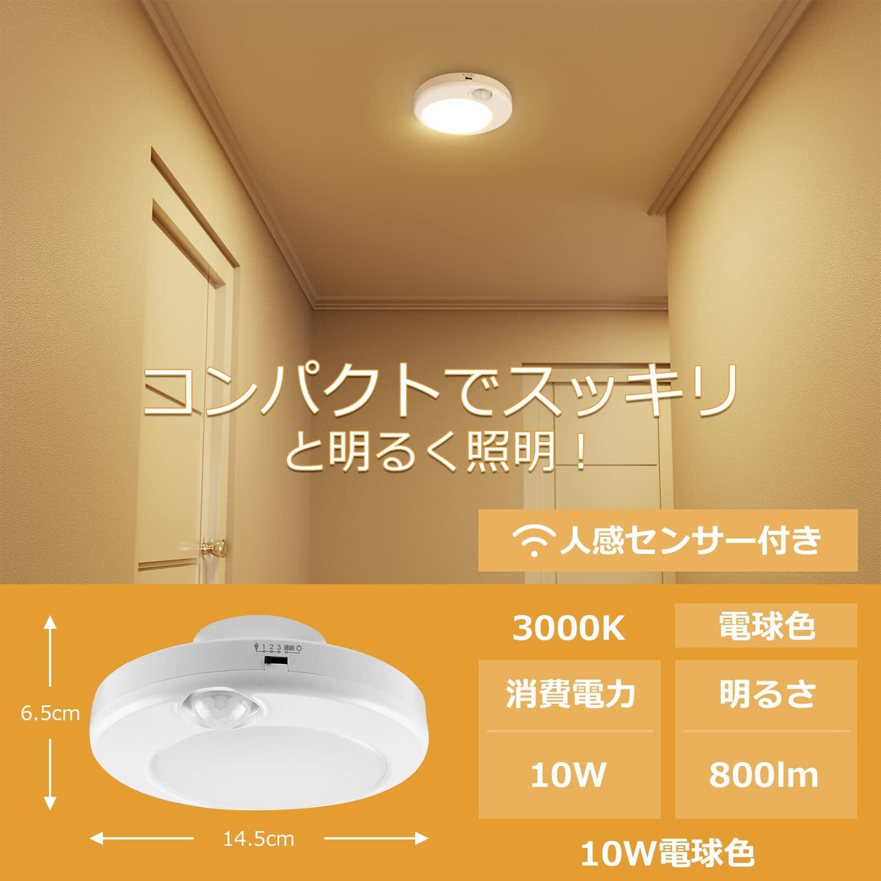 人感 シーリングライト 小型 人感センサー ledシーリングライト 10W 【簡単取付/センサー点灯/留守番機能/800lm高輝度/目に優しい/80Ra高演色性/40000時間寿命/省エネ/PSE認証済み】 玄関 廊下 トイレ 洗面所 脱衣所 ベランダ 天井 和室 洋室 天井照明 室内 コンパクト led照明器具 (3000K電球色)