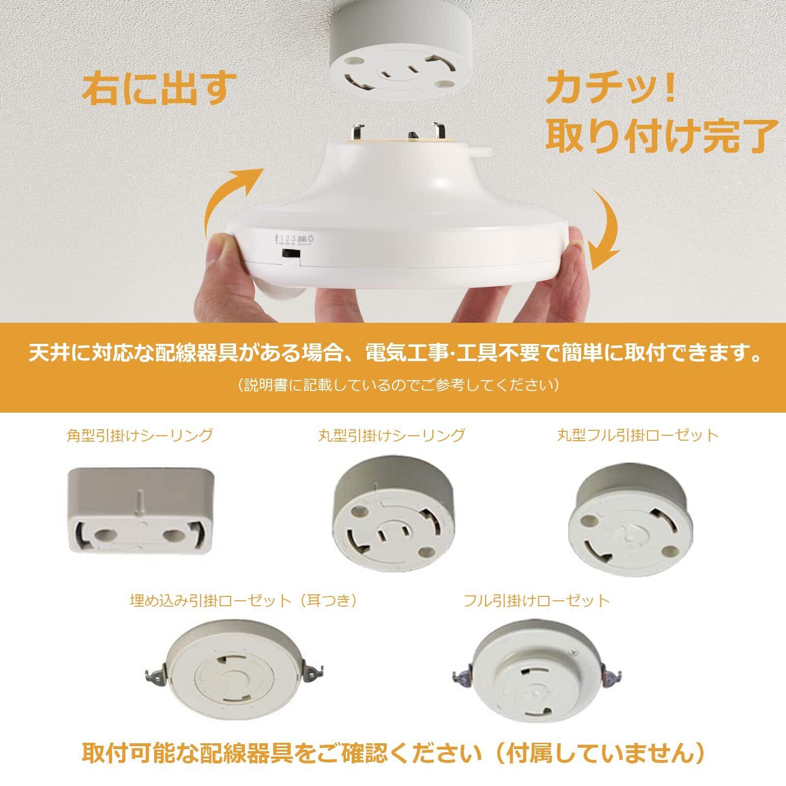 【工事不要・簡単取り付け】天井に配線器具があれば、電気工事や工具なしで片手でも簡単に取り付け可能です。省スペースでワンタッチ設置、柔らかな昼光色が魅力!シーリングライトの取付金具には、日本の照明器具で一般的な引っ掛け金具を使用しております。角型引掛けシーリング、丸型引掛けシーリング、埋込引掛ローゼット(耳つき)、フル引掛ローゼット、丸型フル引掛ローゼットに対応しています。※ご注意:●取り付け前には、必ず取扱説明書をご参照ください。●取り付けまたは取り外しの前には、必ず電源をお切りください。●本体にスイッチは付いておりません。別途スイッチでの入り切り操作が必要です。