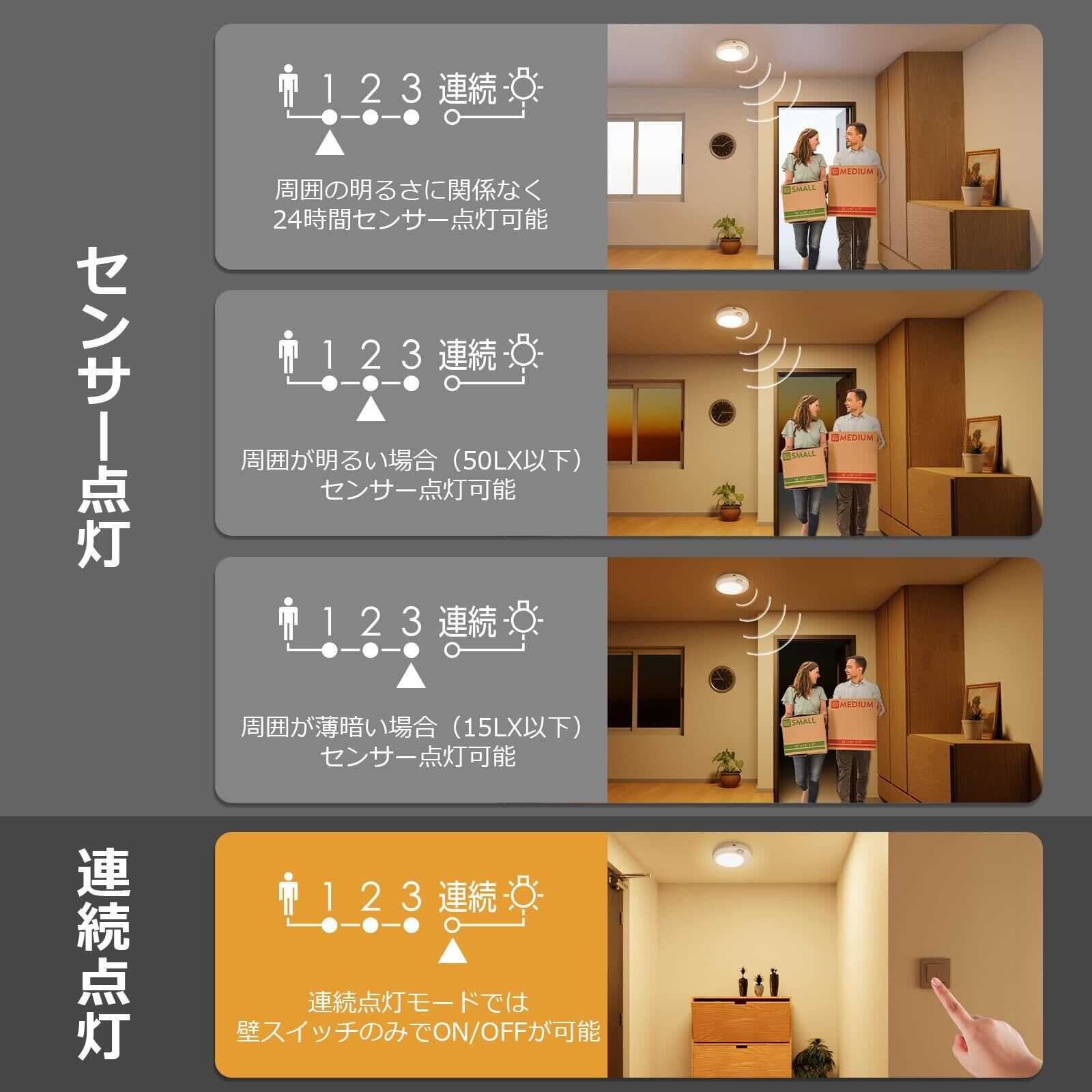 【高感度人感センサー搭載】シーリングライトには連続点灯機能を備えつつ、高感度の人感センサーも搭載されています。人の動きを感知すると、自動的に90秒間点灯します。また、周囲の明るさに応じて、明るさに関係なく点灯、周囲が明るくても点灯、周囲が薄暗いと点灯という3段階の設定が可能です。 調節ツマミ一つで「1-2-3」のセンサーモードを簡単に切り替えられるため、使い勝手も抜群です。