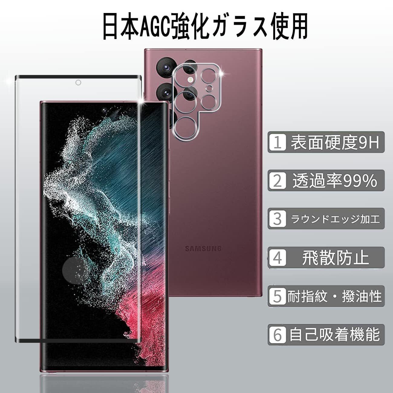 【2+2枚セット 指紋認証対応】 用 Galaxy S22 Ultra ガラスフィルム 2枚 Galaxy S22 Ultra 5G SCG14 SC-52C フィルム + 2枚 カメラ保護フィルムセッ 【 日本旭硝子製 9H強度 】 対応 ギャラクシーS22ウルトラ 強化ガラス 全面 保護フィルム ケース 高透過率 3D Touch対応 厚さ0.26超薄型 飛散防止 高感度 耐衝撃 指紋・汚れ防止 ゼロ気泡 ラウンドエッジ加工 簡単貼り付け