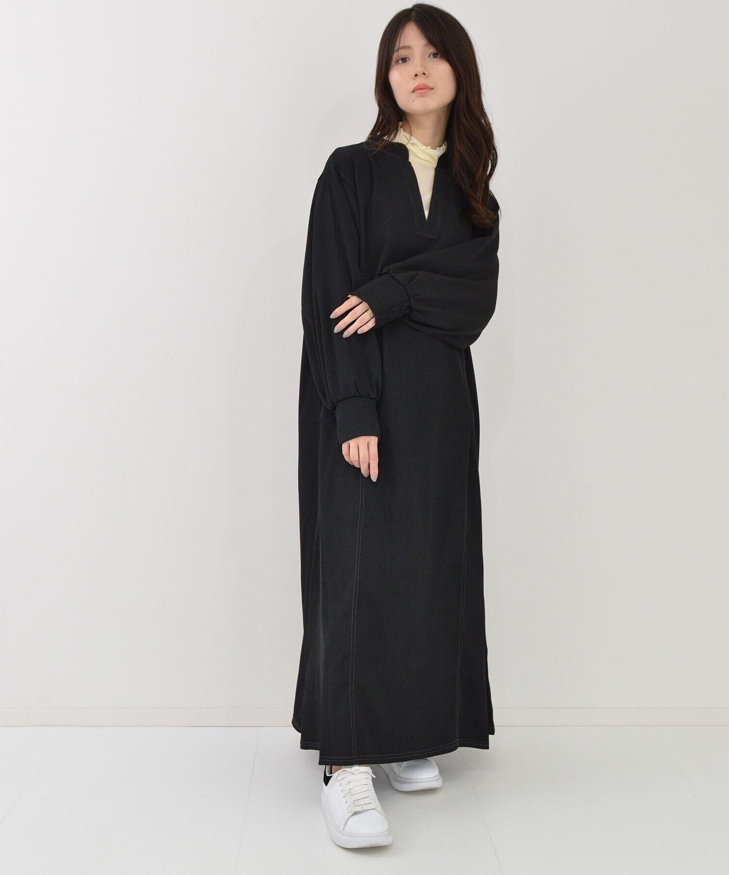 【INTERPLAY select】ツイルロングフレアワンピース 落ち着いた色目が秋冬のコーディネートを引き立てる。フレアデザインで女性らしいシルエットを演出。