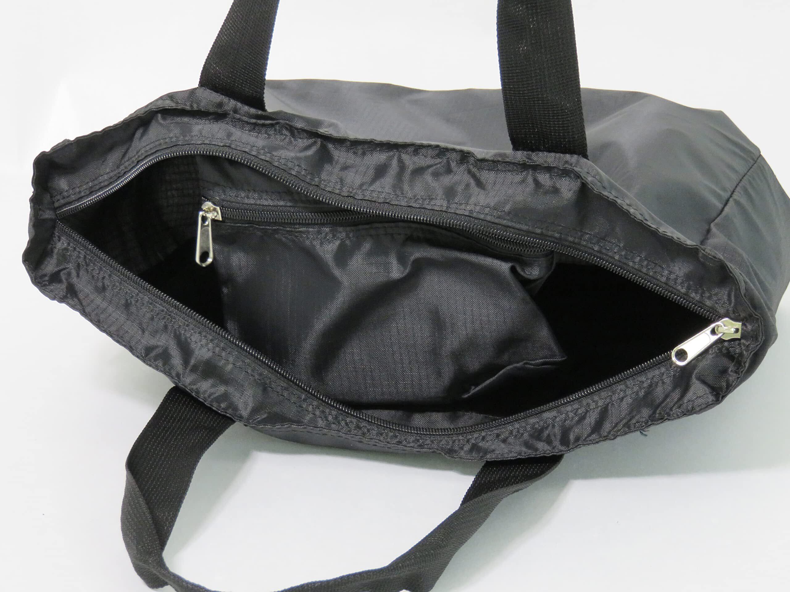 折り畳み式親子バッグ(トートタイプ)。色はブラックとベージュの2色展開。折り畳み式なので、バッグの片隅に常備しておくと便利です。旅行・出張でお土産など荷物が増えた際、いざという時にとても役立ちます。普段使いとしては買い物バッグ(エコバッグ)の代わりに使用するものアリです。折り畳み収納の外袋が、バッグ使用時には内部ファスナーポケットとして使用できます(スナップボタンで取り外し可能)。