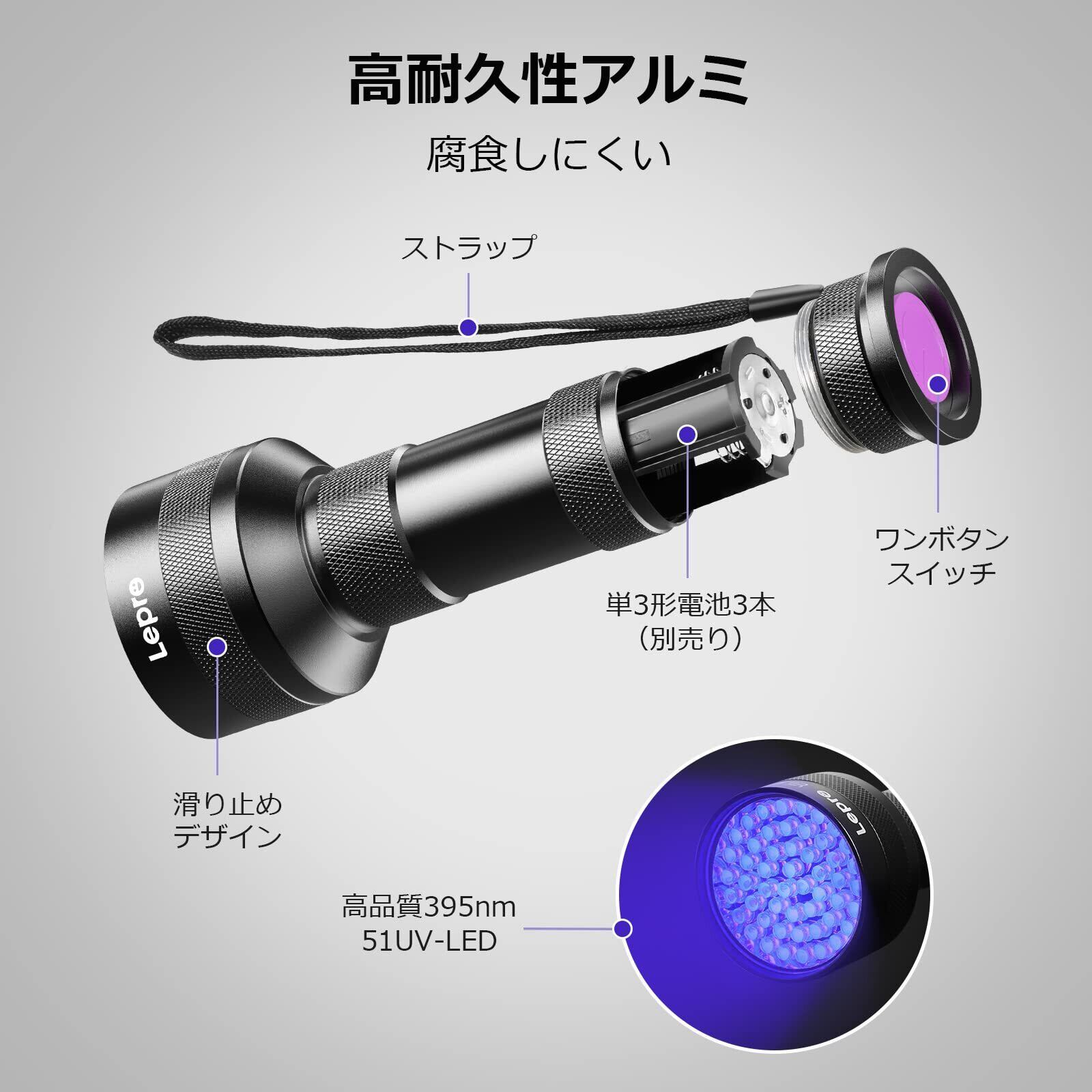 【取扱上の注意】Leproブラックライトは、単3形電池を3本使用します。製品には電池が付属していないため、ご自身でご用意いただく必要があります。●電池を電池パックに取り付ける際は、電池パックの両端にあるプラス極とマイナス極の指示に従ってください。●電池パックを本体に取り付ける際は、電池パックの矢印がLED部分の方向を向くように装着してください。
