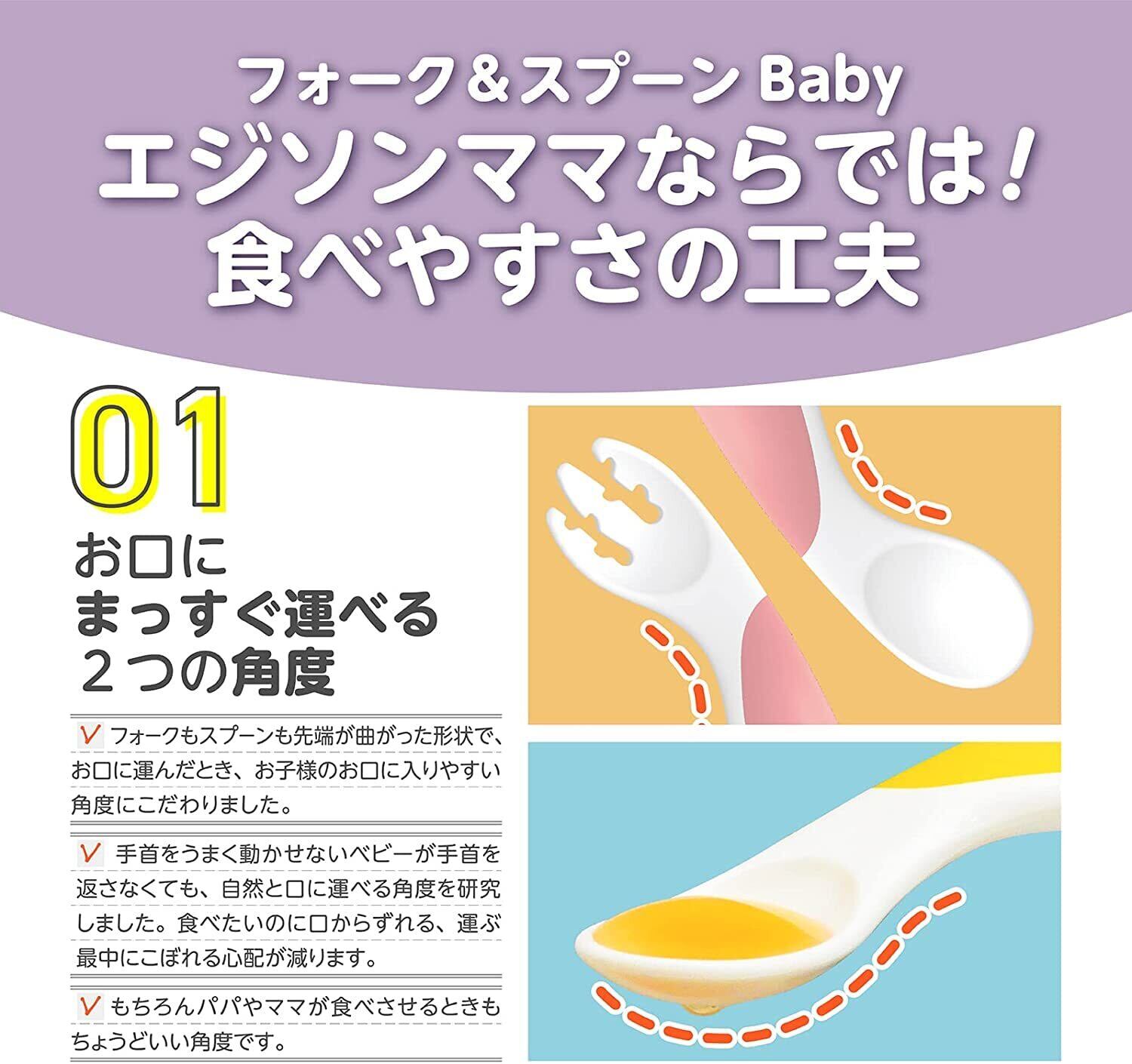 ●お口にまっすぐ運べる2つの角度で、手首をうまく動かせないベビーでもじょうずに食べられます。