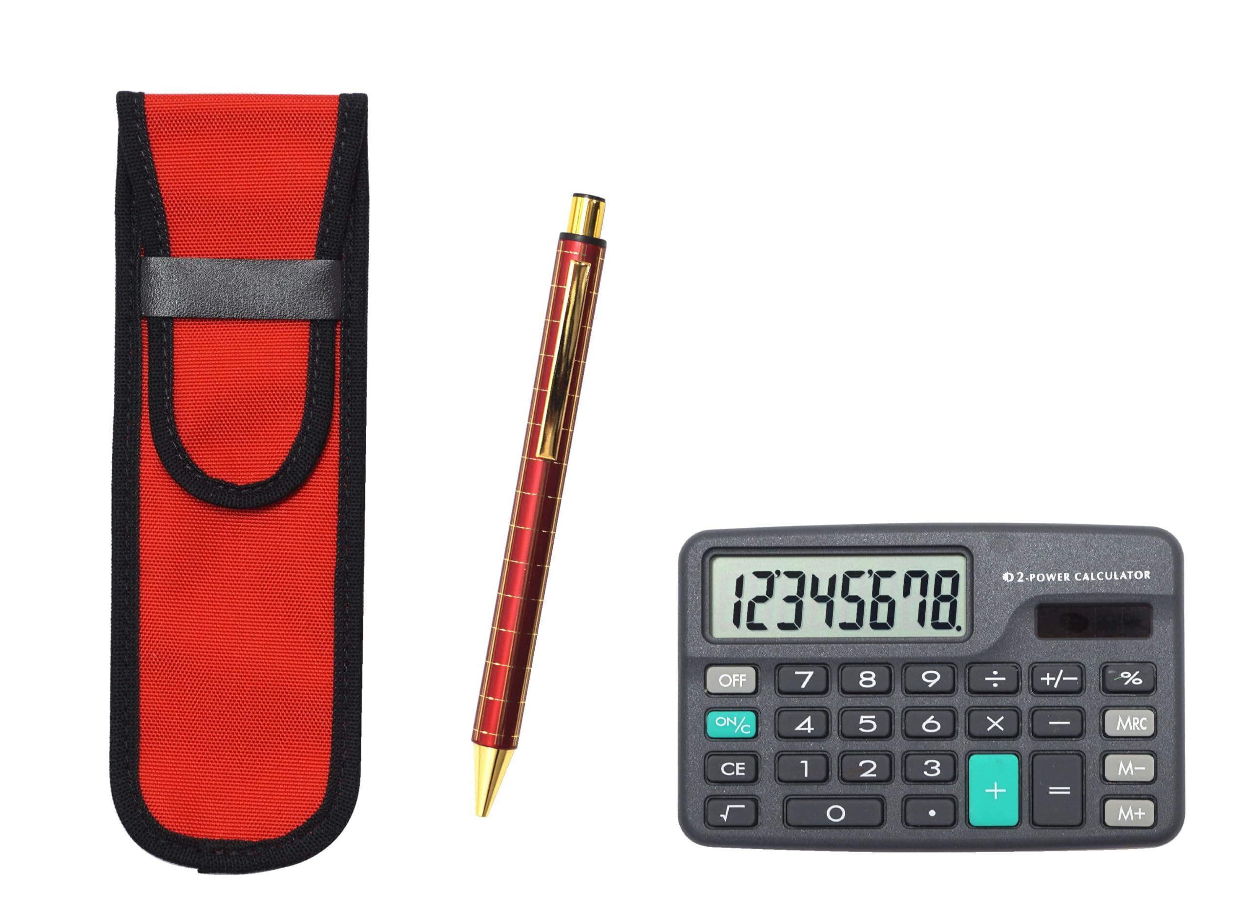 電卓と帯止め式ペンケースと国産太軸金属シャープペン(赤軸)のセット。※ペンケースの中に電卓を入れる事は出来ません。